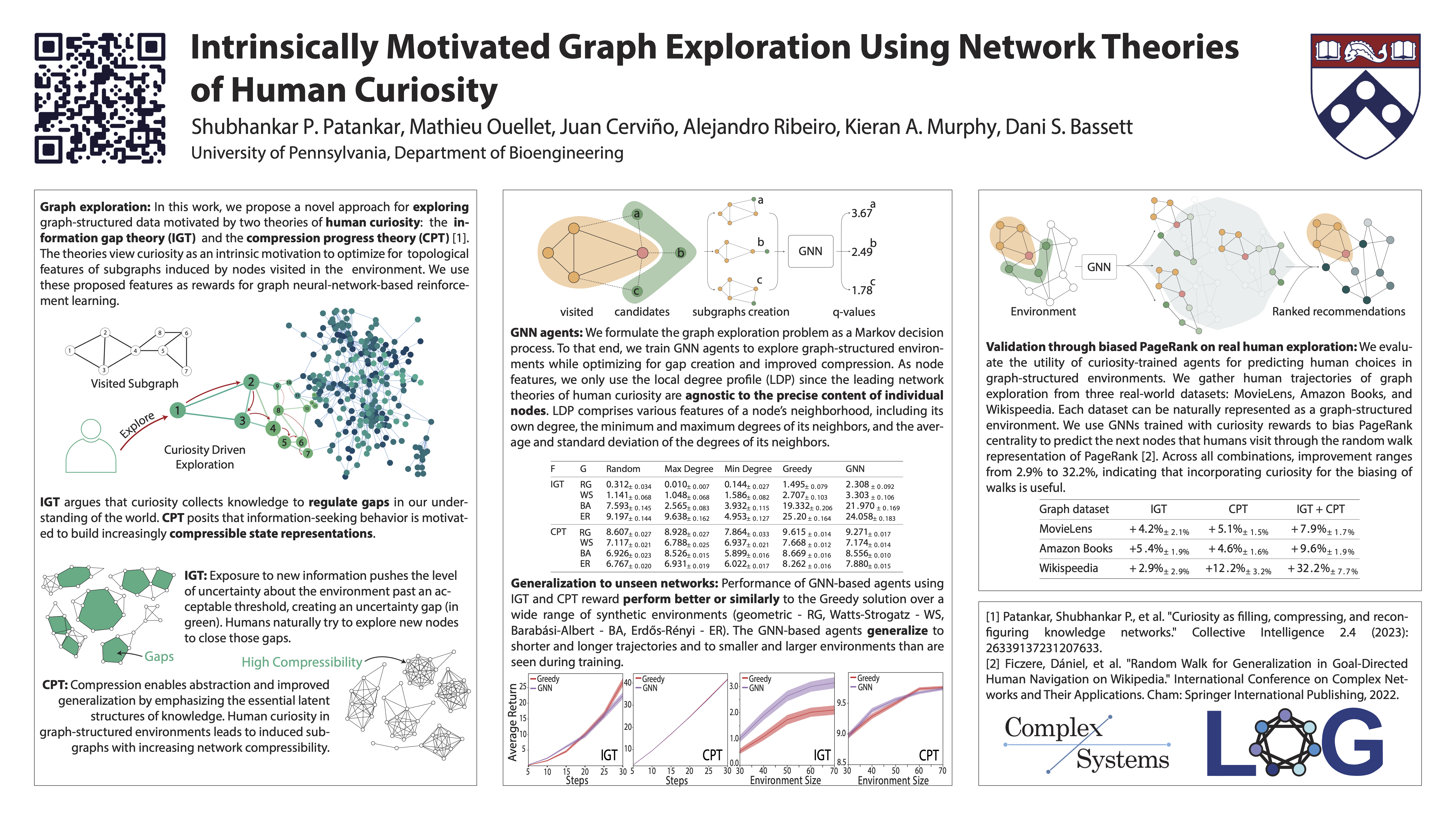Abstract: Intrinsically motivated exploration has proven useful for reinforcement learning, even without additional extrinsic rewards. When the environment is naturally represented as a graph, how to guide exploration best remains an open question. In this work, we propose a novel approach for exploring graph-structured data motivated by two theories of human curiosity: the information gap theory and the compression progress theory. The theories view curiosity as an intrinsic motivation to optimize for topological features of subgraphs induced by nodes visited in the environment. We use these proposed features as rewards for graph neural-network-based reinforcement learning. On multiple classes of synthetically generated graphs, we find that trained agents generalize to longer exploratory walks and larger environments than are seen during training. Our method computes more efficiently than the greedy evaluation of the relevant topological properties. The proposed intrinsic motivations bear particular relevance for recommender systems. We demonstrate that next-node recommendations considering curiosity are more predictive of human choices than PageRank centrality in several real-world graph environments.