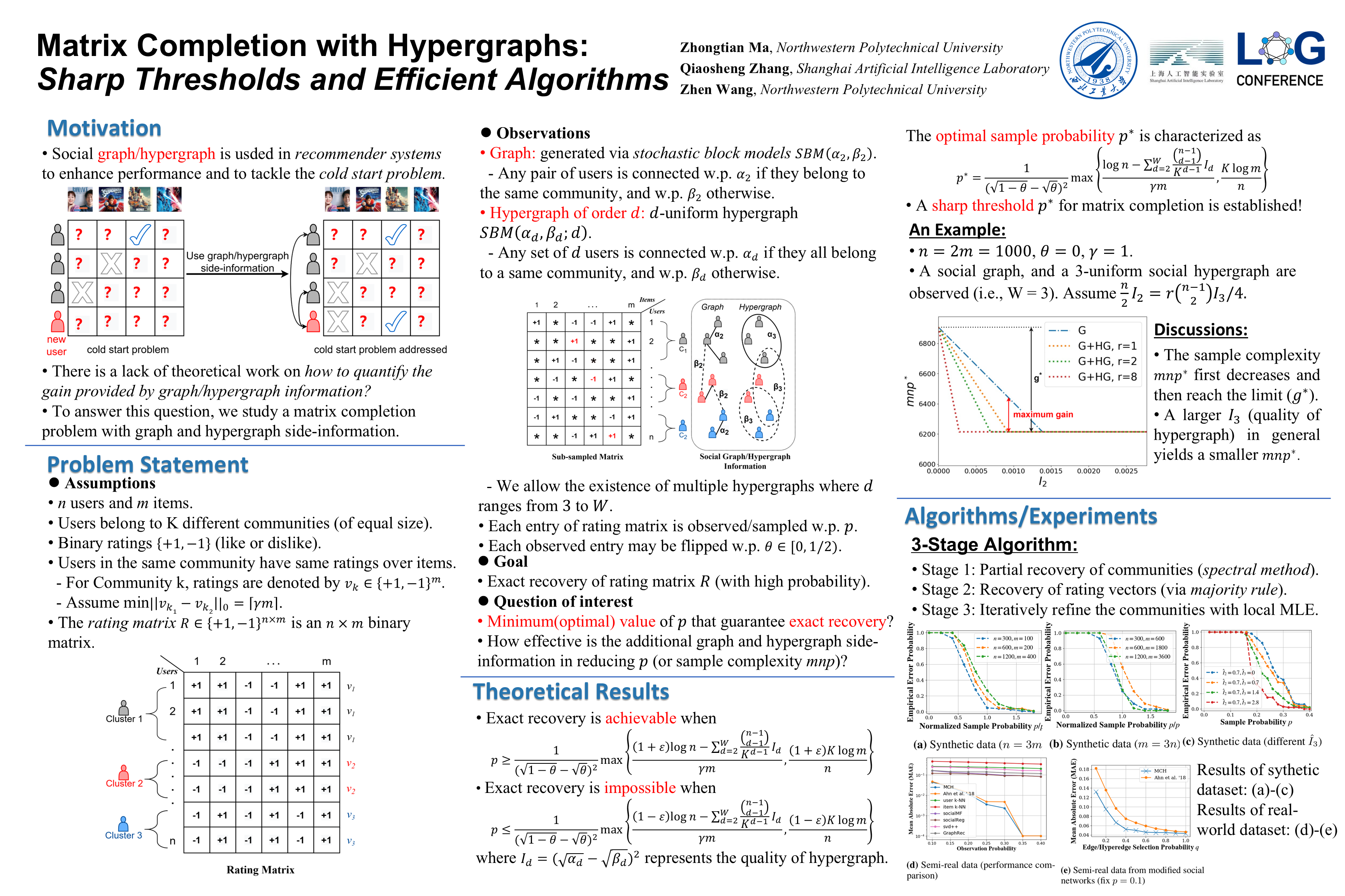 Abstract: This paper considers the problem of completing a rating matrix based on sub-sampled matrix entries as well as observed social graphs and hypergraphs. We show that there exists a *sharp threshold* on the sample probability for the task of exactly completing the rating matrix---the task is achievable when the sample probability is above the threshold, and is impossible otherwise---demonstrating a phase transition phenomenon. The threshold can be expressed as a function of the ``quality'' of hypergraphs, enabling us to *quantify* the amount of reduction in sample probability due to the exploitation of hypergraphs. This also highlights the usefulness of hypergraphs in the matrix completion problem. En route to discovering the sharp threshold, we develop a computationally efficient matrix completion algorithm that effectively exploits the observed graphs and hypergraphs. Theoretical analyses show that our algorithm succeeds with high probability as long as the sample probability exceeds the aforementioned threshold, and this theoretical result is further validated by synthetic experiments. Moreover, our experiments on a real social network dataset (with both graphs and hypergraphs) show that our algorithm outperforms other state-of-the-art matrix completion algorithms.