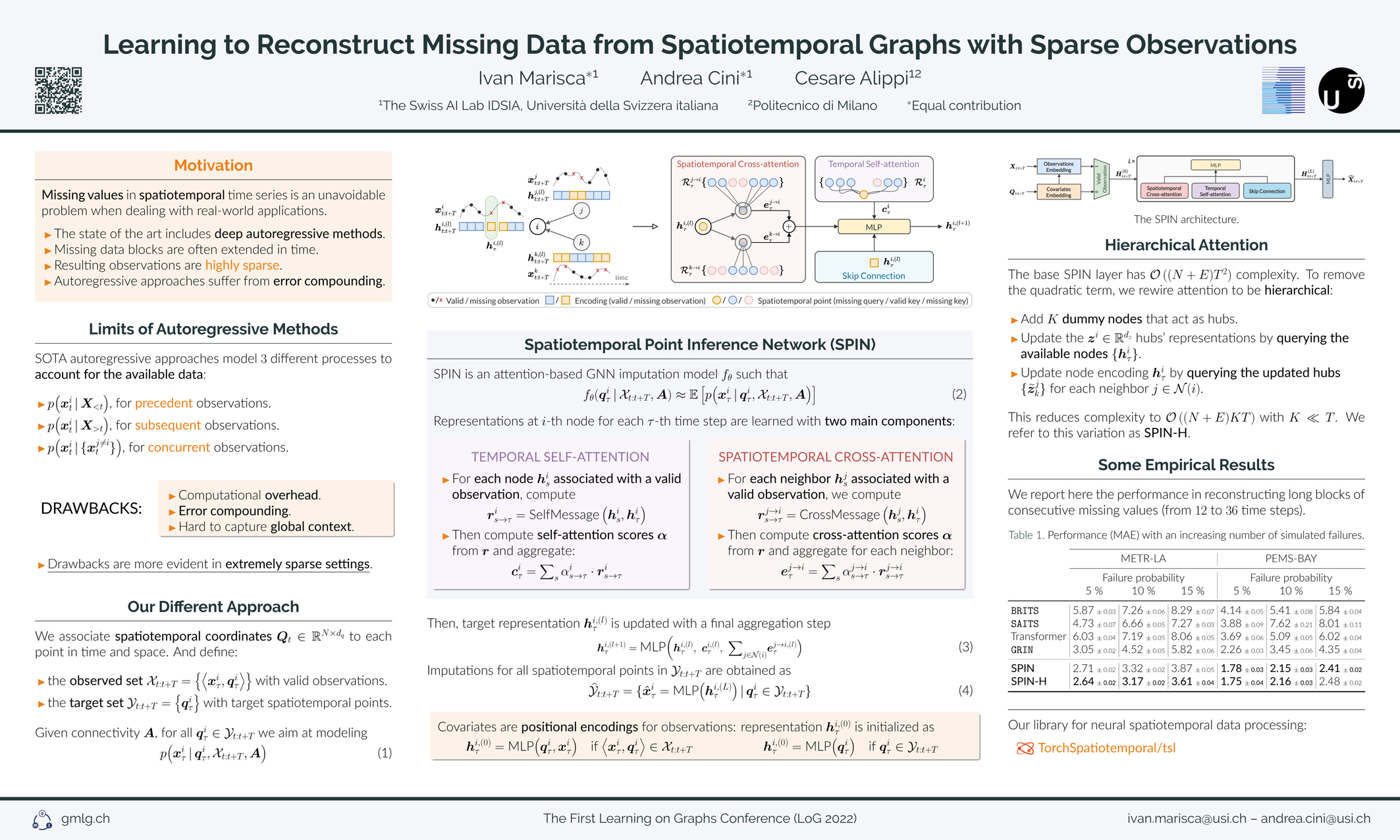 Abstract: Modeling multivariate time series as temporal signals over a (possibly dynamic) graph is an effective representational framework that allows for developing models for time series analysis. Spatiotemporal graphs are often highly sparse, with time series characterized by multiple, concurrent, and even long sequences of missing data, e.g., due to the unreliable underlying sensor network. In this context, autoregressive models can be brittle and exhibit unstable learning dynamics. The objective of this paper is to tackle the problem of learning effective models to reconstruct, i.e., impute, missing data points by conditioning the reconstruction only on the available observations. In particular, we propose a novel class of attention-based architectures that, given a set of highly sparse discrete observations, learn a representation for points in time and space by exploiting a spatiotemporal propagation architecture aligned with the imputation task. Representations are learned end-to-end to reconstruct observations w.r.t. the corresponding sensor and its neighboring nodes. Compared to the state of the art, our model handles sparse data without propagating prediction errors or requiring a bidirectional model to encode forward and backward time dependencies. Empirical results on representative benchmarks show the effectiveness of the proposed method.