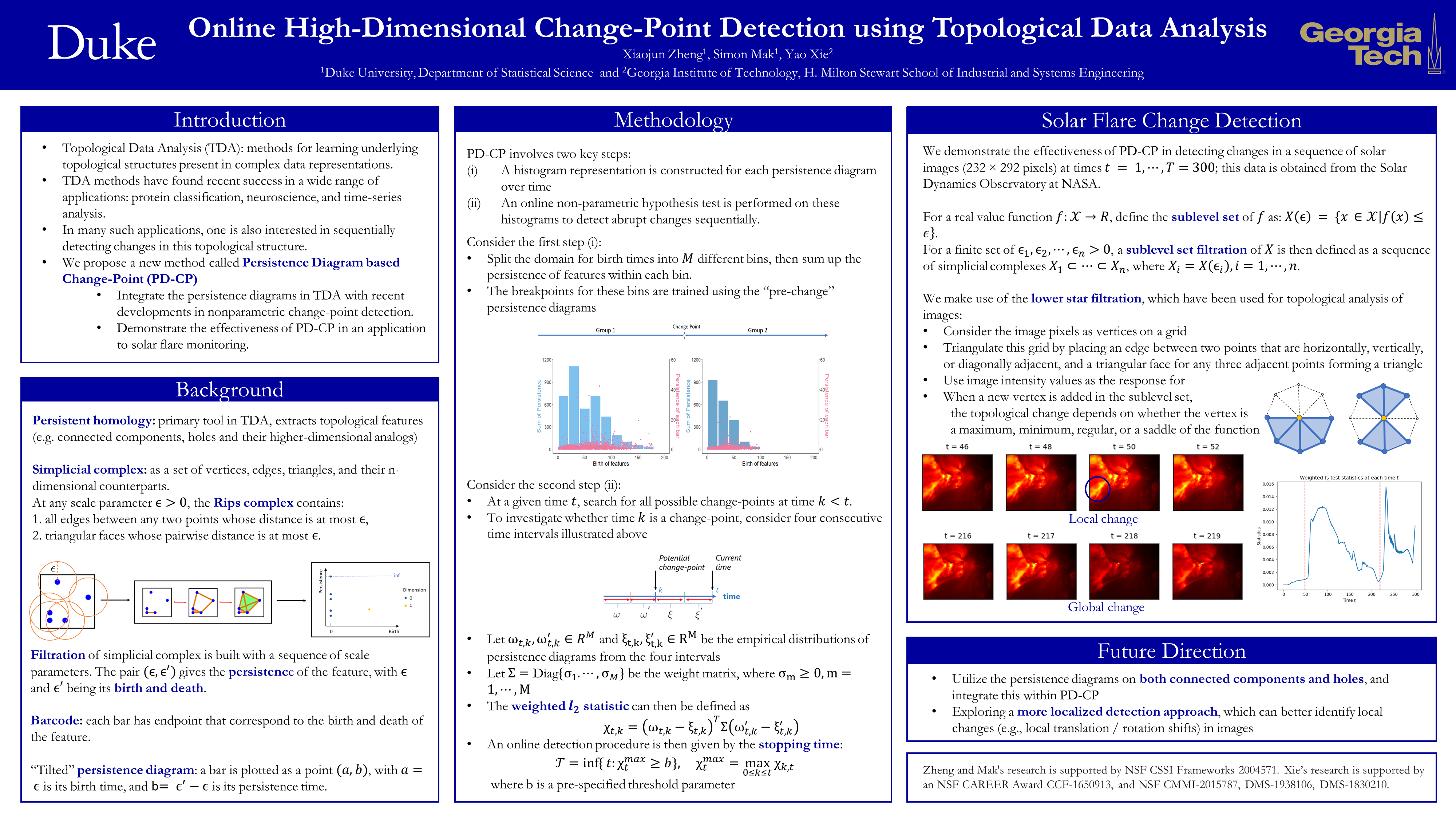 Abstract: Topological Data Analysis (TDA) is a rapidly growing field, which studies methods for learning underlying topological structures present in complex data representations. TDA methods have found recent success in extracting useful geometric structures for a wide range of applications, including protein classification, neuroscience, and time-series analysis. However, in many such applications, one is also interested in sequentially detecting changes in this topological structure. We propose a new method called Persistence Diagram based Change-Point (PD-CP), which tackles this problem by integrating the widely-used persistence diagrams in TDA with recent developments in nonparametric change-point detection. The key novelty in PD-CP is that it leverages the distribution of points on persistence diagrams for online detection of topological changes. We demonstrate the effectiveness of PD-CP in an application to solar flare monitoring.