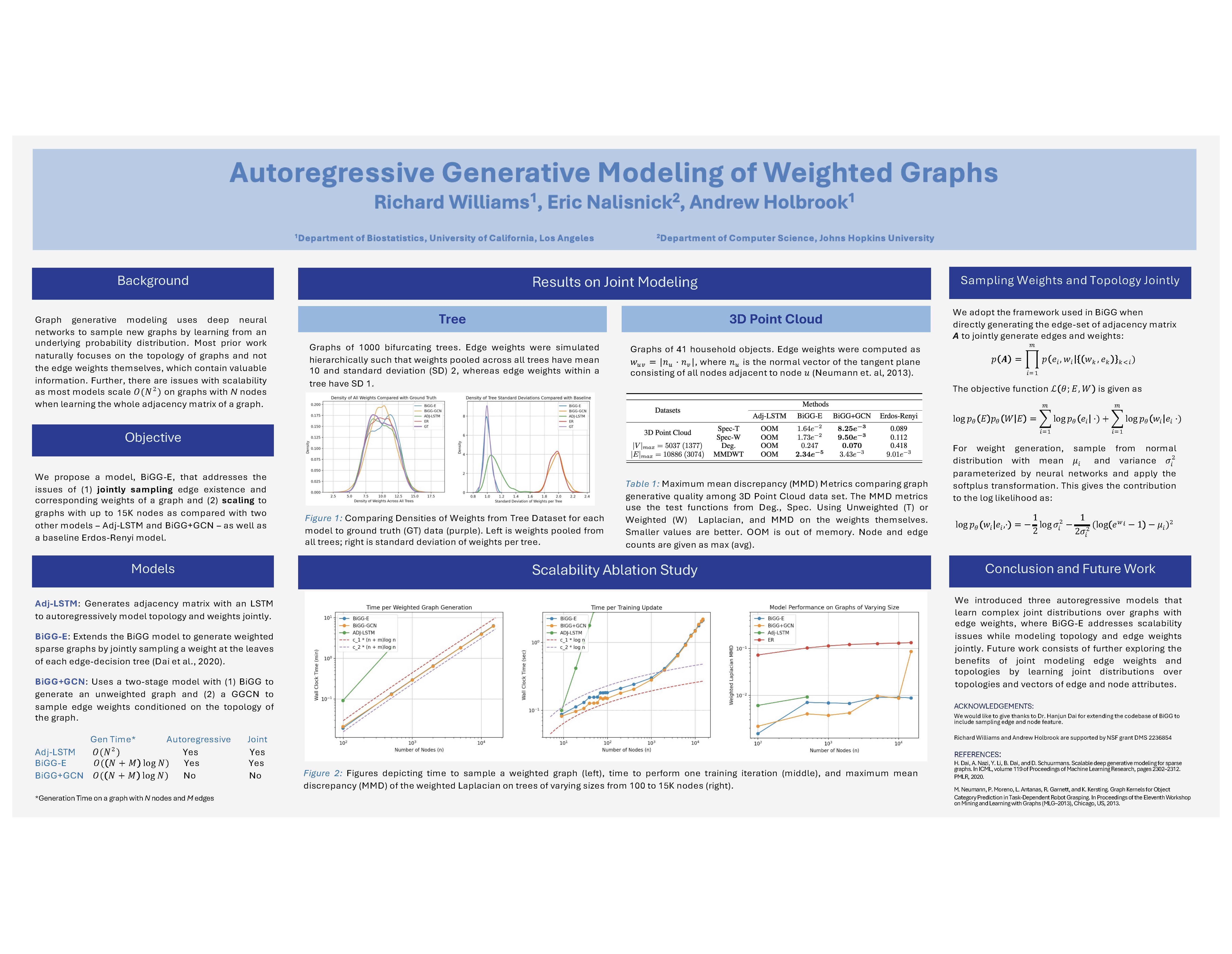 Abstract: Weighted graphs are ubiquitous throughout biology, chemistry, and the social sciences. However, most current deep generative models are designed for unweighted graphs and are not easily extended to weighted topologies. This paper proposes two autoregressive models on weighted graphs: the Adjacency-LSTM and BiGG-E. Experiments on a variety of benchmark datasets demonstrate that both models adequately capture distributions over weighted graphs while remaining computationally scalable. Specifically, we experiment with Erdős–Rényi, tree, lobster, and 3D point cloud graph data sets.