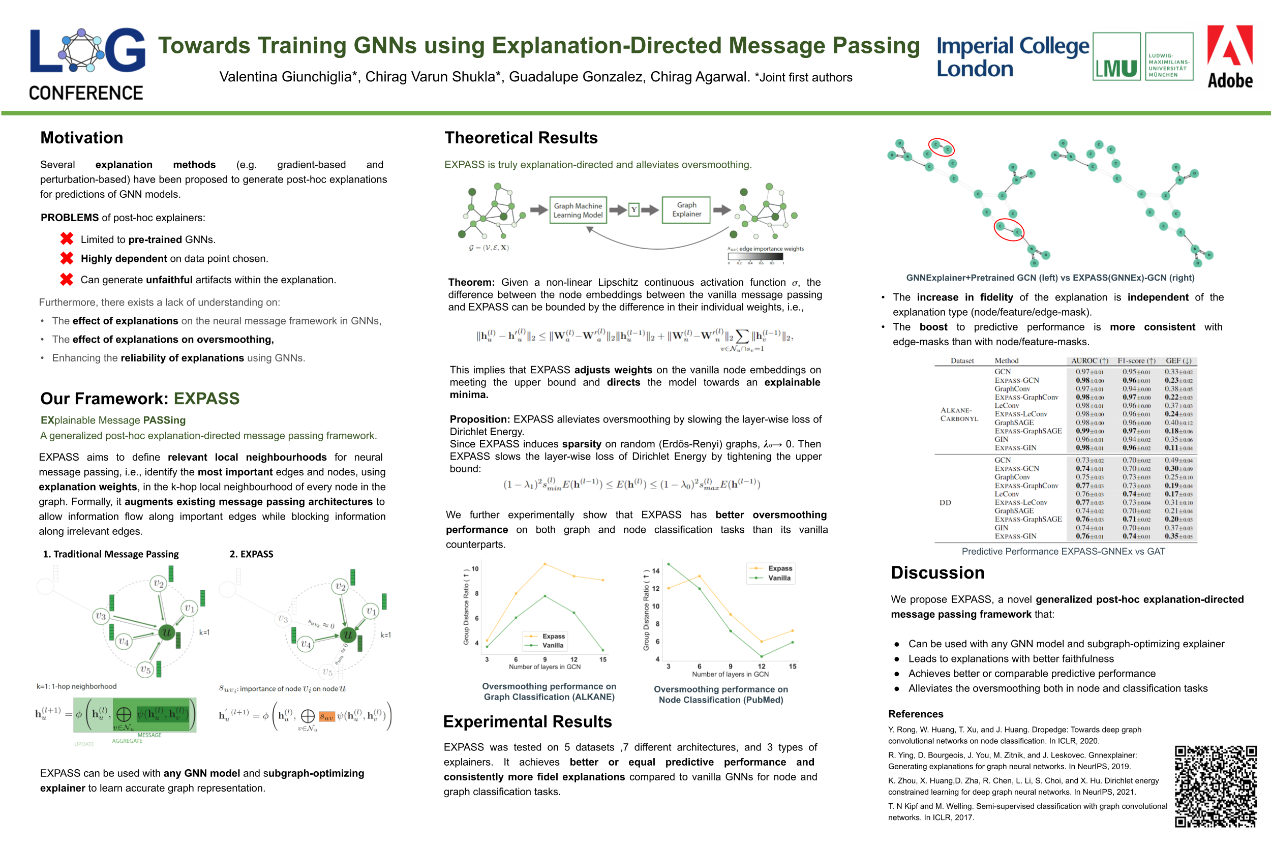 Abstract: With the increasing use of Graph Neural Networks (GNNs) in critical real-world applications, several post hoc explanation methods have been proposed to understand their predictions. However, there has been no work in generating explanations on the fly during model training and utilizing them to improve the expressive power of the underlying GNN models. In this work, we introduce a novel explanation-directed neural message passing framework for GNNs, EXPASS (EXplainable message PASSing), which aggregates only embeddings from nodes and edges identified as important by a GNN explanation method. EXPASS can be used with any existing GNN architecture and subgraph-optimizing explainer to learn accurate graph embeddings. We theoretically show that EXPASS alleviates the oversmoothing problem in GNNs by slowing the layer-wise loss of Dirichlet energy and that the embedding difference between the vanilla message passing and EXPASS framework can be upper bounded by the difference of their respective model weights. Our empirical results show that graph embeddings learned using EXPASS improve the predictive performance and alleviate the oversmoothing problems of GNNs, opening up new frontiers in graph machine learning to develop explanation-based training frameworks.