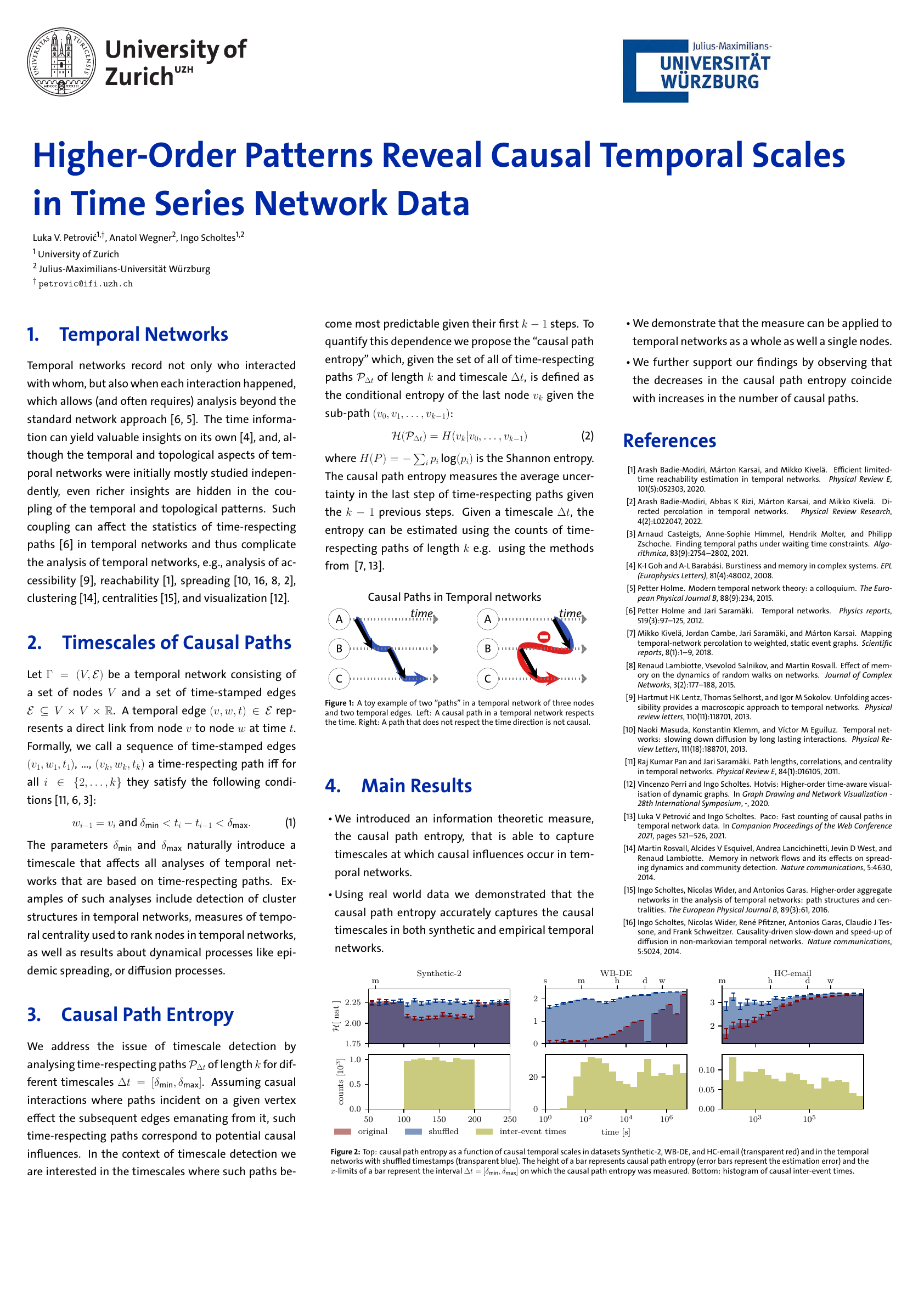 Abstract: The analysis of temporal networks heavily depends on the analysis of time-respecting paths. However, before being able to model and analyze the time-respecting paths, we have to infer the timescales at which the temporal edges influence each other. In this work we introduce an information theoretic measure, the causal path entropy, with the aim to detect the timescales at which the causal influences occur in temporal networks. The measure can be used on temporal networks as a whole, or separately for each node. We find that the causal path entropy has a non-trivial dependency on the causal timescales of synthetic and empirical temporal networks. Furthermore, we notice in both synthetic and empirical data that the entropy tends to decrease at timescales that correspond to the causal paths. Our results imply that timescales relevant for the dynamics of complex systems can be detected in the temporal networks themselves, by measuring higher-order correlations. This is crucial for the analysis of temporal networks where inherent timescales are unavailable and hard to measure.