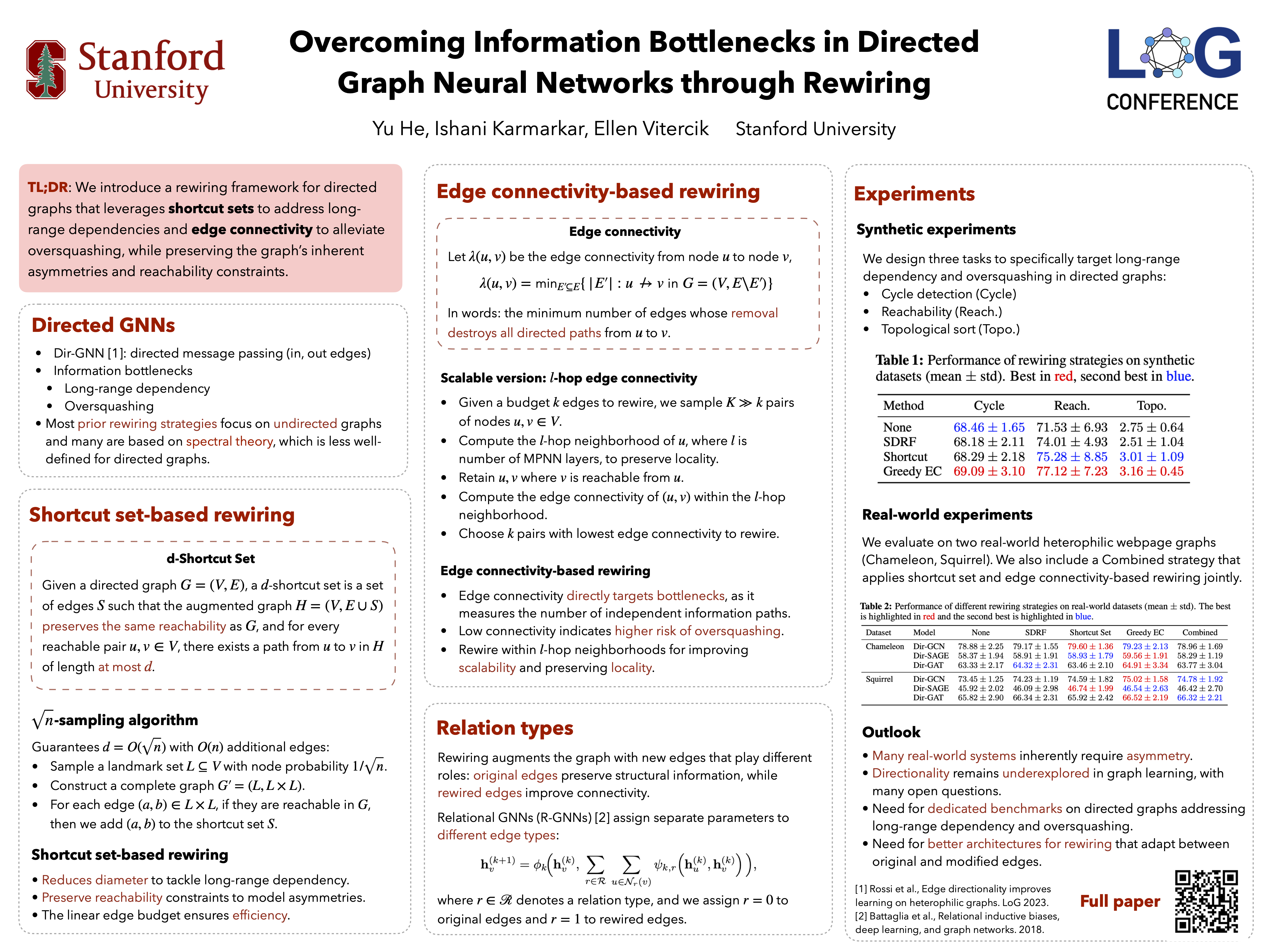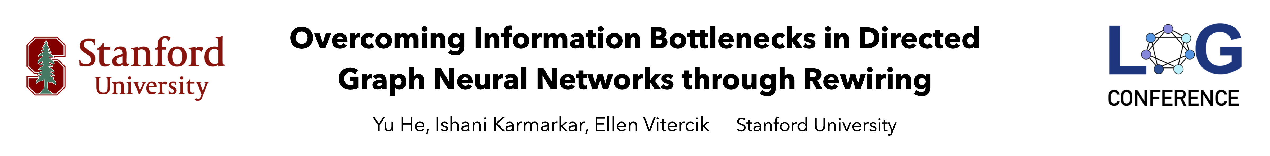Abstract: Graph Neural Networks (GNNs) have become an essential tool in relational learning. However, most research has focused on undirected graphs, overlooking the directional structure that shapes many real-world systems. Directionality encodes important asymmetries in domains such as traffic routing, social networks, and causal modeling, where ignoring edge orientation may lose semantic information and hinder predictive performance. At the same time, message passing in GNNs is limited by over-squashing and long-range dependency, challenges that can be alleviated by modifying the graph topology. While recent rewiring techniques based on spectral graph theory have shown promise for undirected graphs, they do not extend naturally to directed settings. In this work, we introduce a rewiring framework for directed graphs that improves information flow while preserving inherent asymmetries and reachability constraints. Our method directly tackles over-squashing and long-range dependency issues, advancing graph rewiring into the directed regime and broadening the use of GNNs in critical real-world tasks.