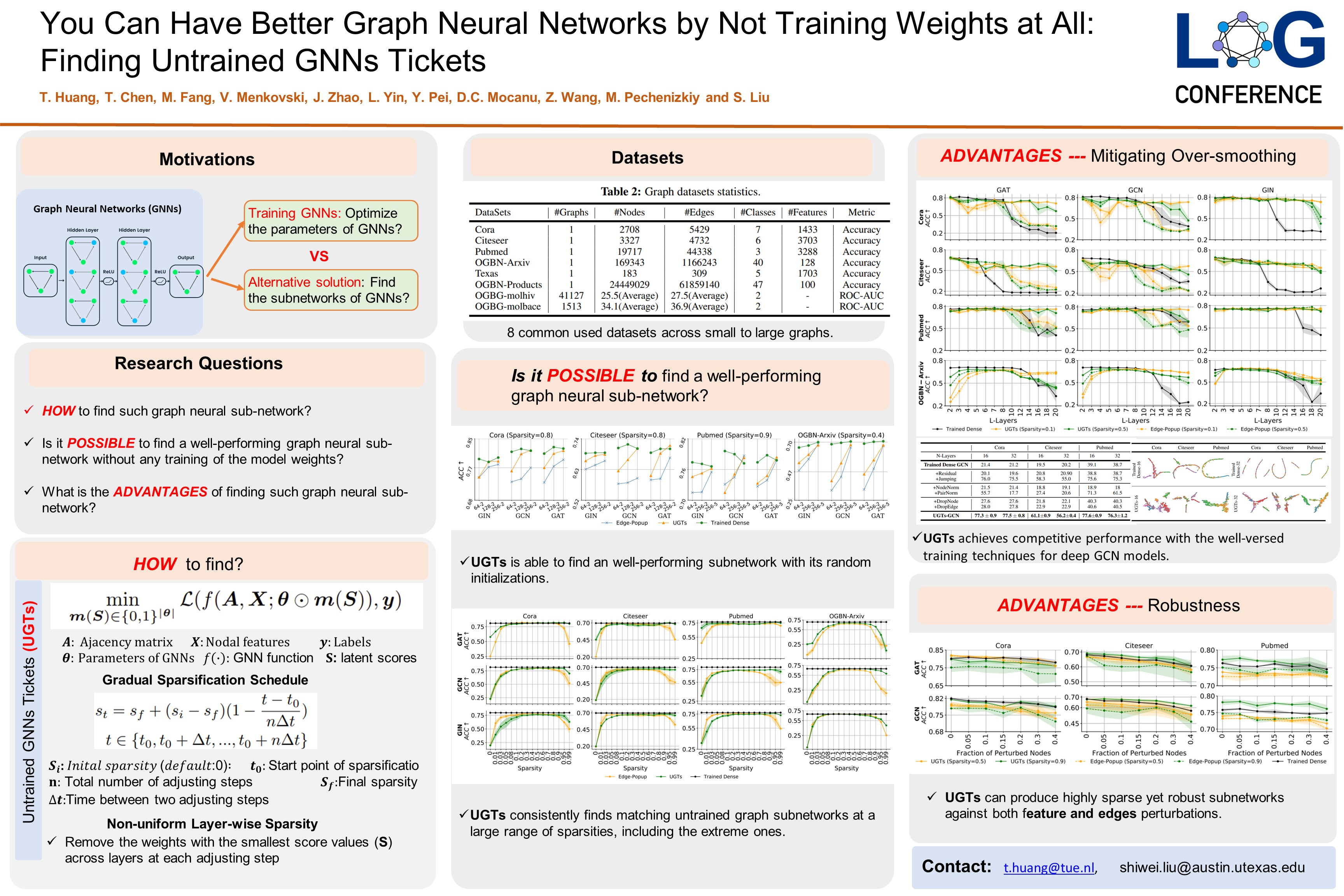 Abstract: Recent works have impressively demonstrated that there exists a subnetwork in randomly initialized convolutional neural networks (CNNs) that can match the performance of the fully trained dense networks at initialization, without any optimization of the weights of the network (i.e., untrained networks). However, the presence of such untrained subnetworks in graph neural networks (GNNs) still remains mysterious. In this paper we carry out the first-of-its-kind exploration of discovering matching untrained GNNs. With sparsity as the core tool, we can find untrained sparse subnetworks at the initialization, that can match the performance of fully trained dense GNNs. Besides this already encouraging finding of comparable performance, we show that the found untrained subnetworks can substantially mitigate the GNN over-smoothing problem, hence becoming a powerful tool to enable deeper GNNs without bells and whistles. We also observe that such sparse untrained subnetworks have appealing performance in out-of-distribution detection and robustness of input perturbations. We evaluate our method across widely-used GNN architectures on various popular datasets including the Open Graph Benchmark (OGB).