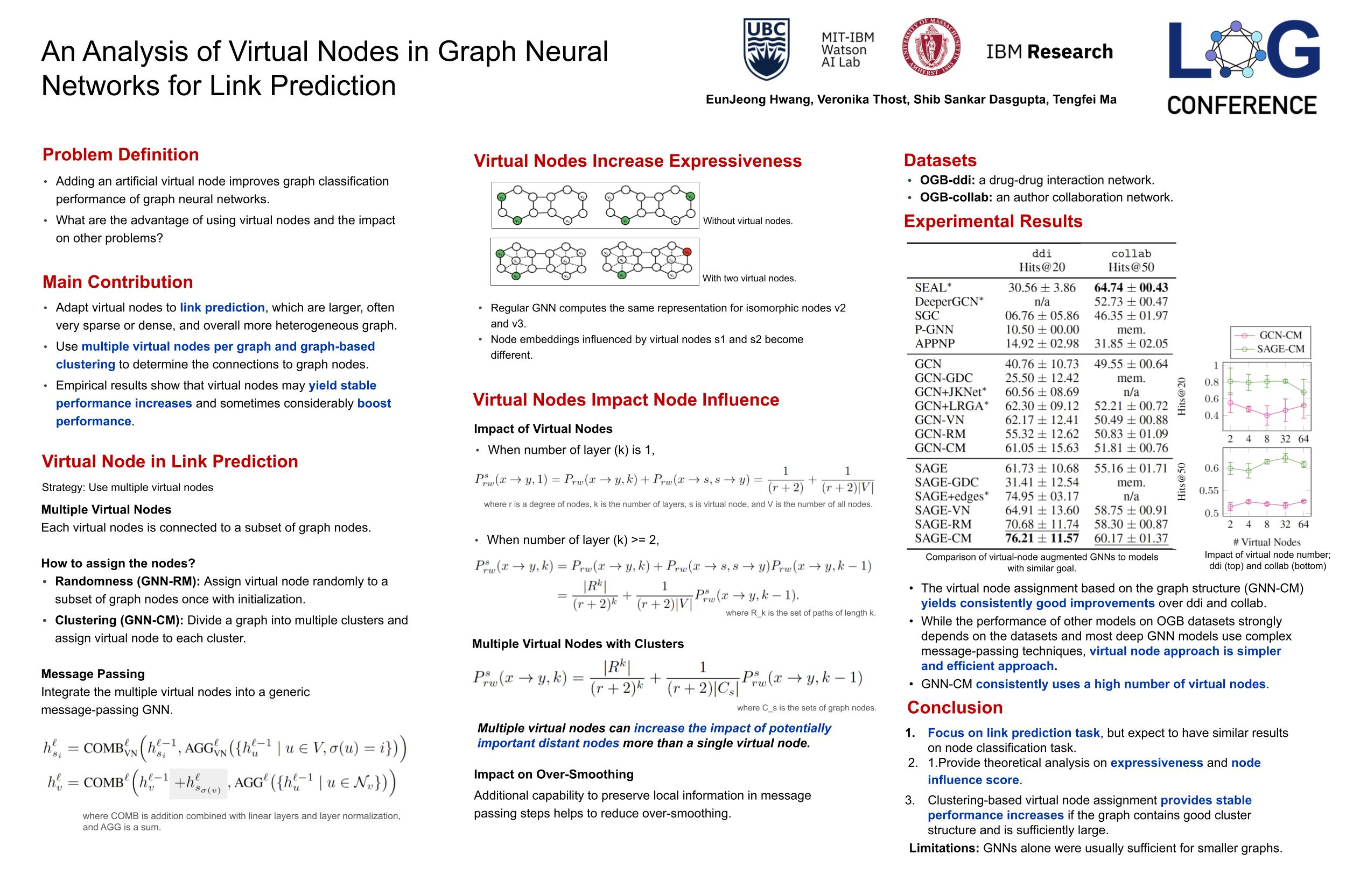 Abstract: It is well known that the graph classification performance of graph neural networks often improves by adding an artificial virtual node to the graphs, which is connected to all graph nodes. Surprisingly, the advantage of using virtual nodes has never been theoretically investigated, and their impact on other problems is still an open research question. In this paper, we adapt the concept of virtual nodes to link prediction, where we usually have much larger, often very sparse or dense, and overall more heterogeneous graphs. In particular, we use multiple virtual nodes per graph and graph-based clustering to determine the connections to the graph nodes. We also provide a detailed theoretical analysis. We conducted experiments over different datasets of the Open Graph Benchmark, analyze the results in detail, and show that virtual nodes may yield rather stable performance increases and sometimes considerably boost performance.