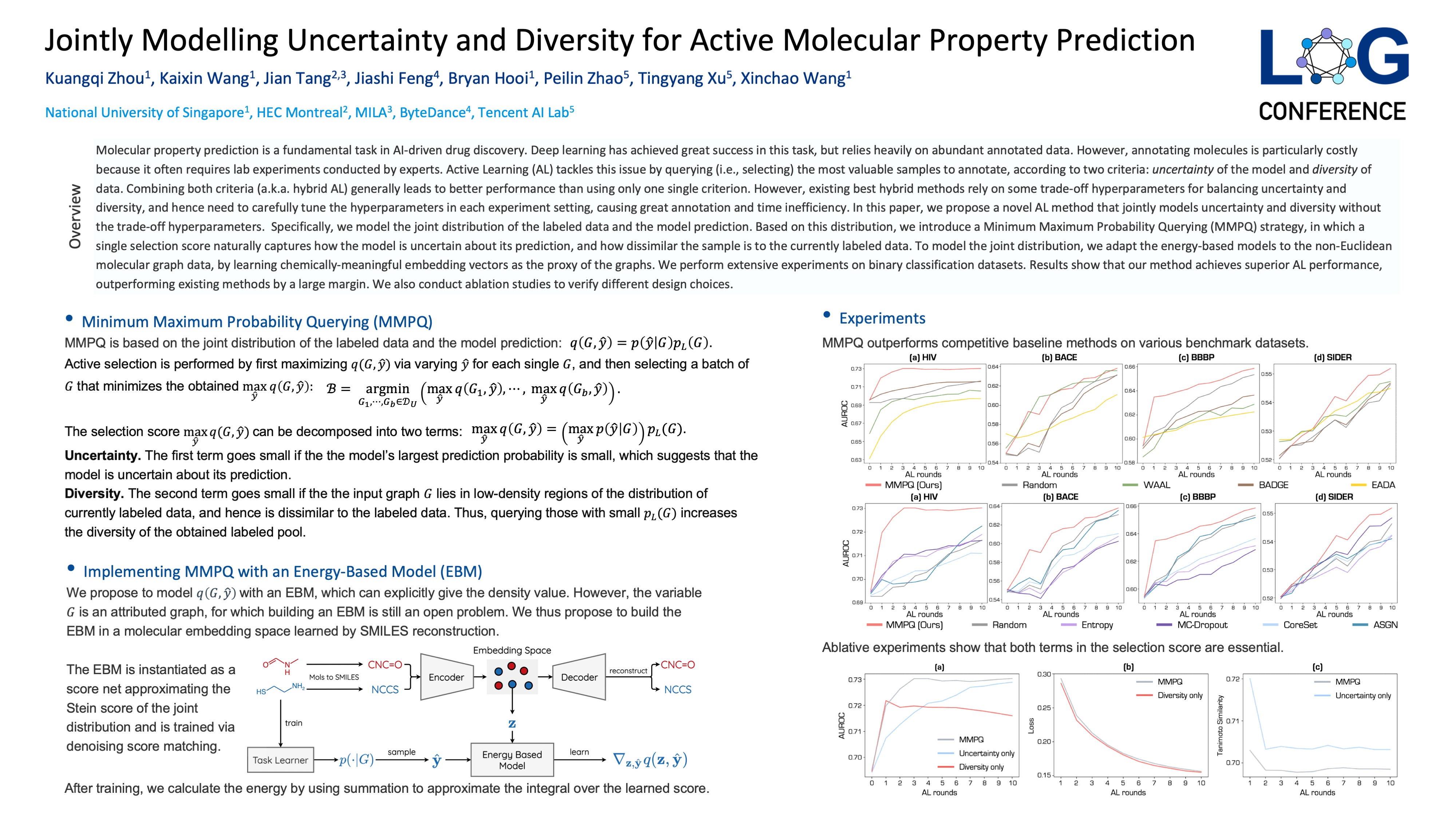 Abstract: Molecular property prediction is a fundamental task in AI-driven drug discovery. Deep learning has achieved great success in this task, but relies heavily on abundant annotated data. However, annotating molecules is particularly costly because it often requires lab experiments conducted by experts. Active Learning (AL) tackles this issue by querying (i.e., selecting) the most valuable samples to annotate, according to two criteria: uncertainty of the model and diversity of data. Combining both criteria (a.k.a. hybrid AL) generally leads to better performance than using only one single criterion. However, existing best hybrid methods rely on some trade-off hyperparameters for balancing uncertainty and diversity, and hence need to carefully tune the hyperparameters in each experiment setting, causing great annotation and time inefficiency. In this paper, we propose a novel AL method that jointly models uncertainty and diversity without the trade-off hyperparameters. Specifically, we model the joint distribution of the labeled data and the model prediction. Based on this distribution, we introduce a Minimum Maximum Probability Querying (MMPQ) strategy, in which a single selection score naturally captures how the model is uncertain about its prediction, and how dissimilar the sample is to the currently labeled data. To model the joint distribution, we adapt the energy-based models to the non-Euclidean molecular graph data, by learning chemically-meaningful embedding vectors as the proxy of the graphs. We perform extensive experiments on binary classification datasets. Results show that our method achieves superior AL performance, outperforming existing methods by a large margin. We also conduct ablation studies to verify different design choices of our approach.