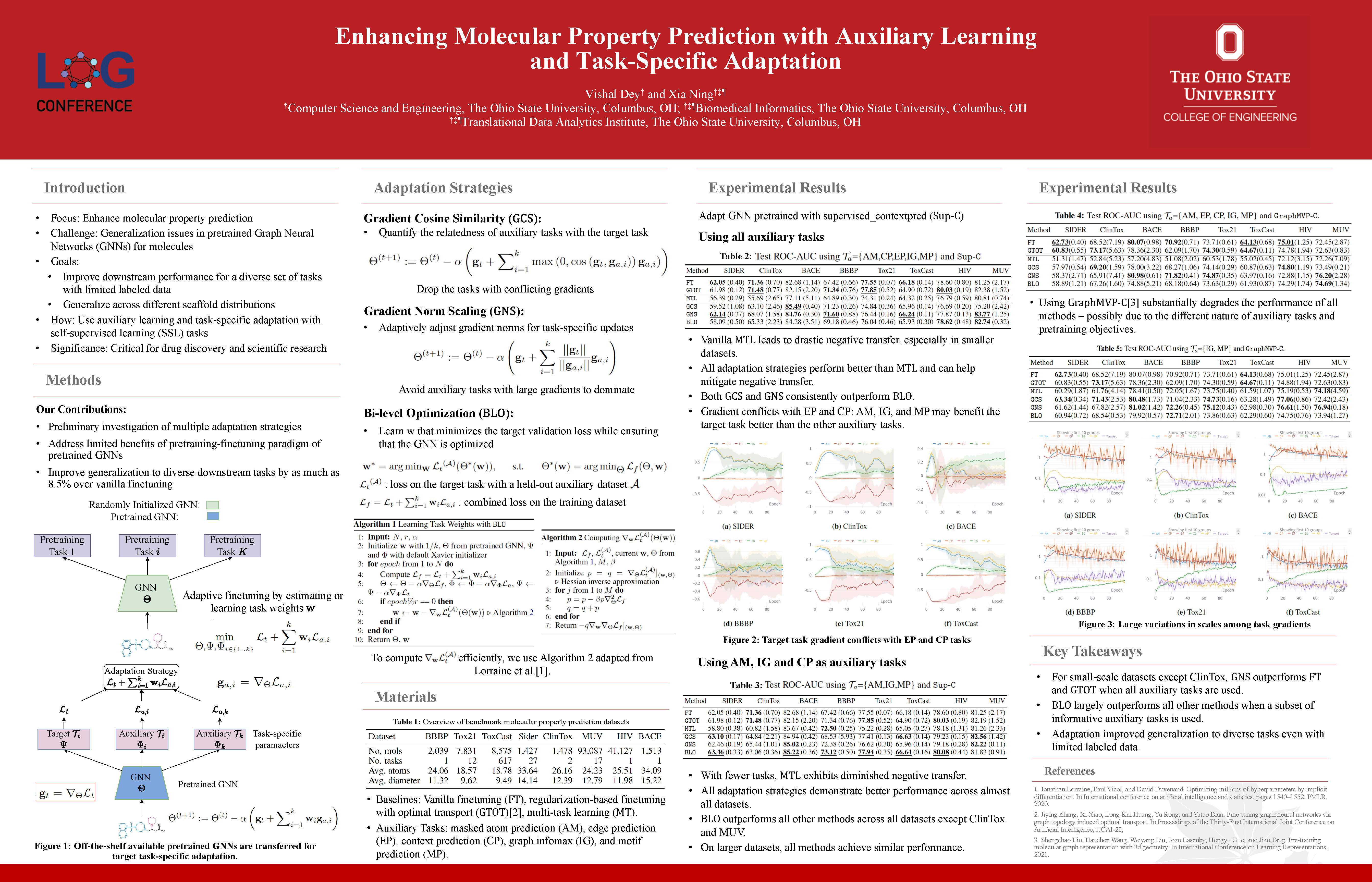 Abstract: Pretrained Graph Neural Networks (GNNs) have been widely adopted for various molecular property prediction tasks. Despite their ability to capture rich chemical knowledge, traditional finetuning of such pretrained GNNs on the target task can lead to poor generalization. To address this, we explore the adaptation of pretrained GNNs to the target task by jointly training them with multiple auxiliary tasks. This could enable the GNNs to learn both general and task-specific features, which may benefit the target task. However, an effective adaptation strategy needs to determine the relevance of auxiliary tasks with the target task, which poses a major challenge. In this regard, we investigate multiple strategies to adaptively combine task gradients or learn task weights via bi-level optimization. Our experiments with state-of-the-art pretrained GNNs demonstrate the efficacy of our proposed methods, with improvements of up to 8.45% over finetuning. Overall, this suggests that incorporating auxiliary tasks along with target task fine-tuning can be an effective way to improve the generalizability of pretrained GNNs for molecular property prediction tasks, and thus inspires future research.