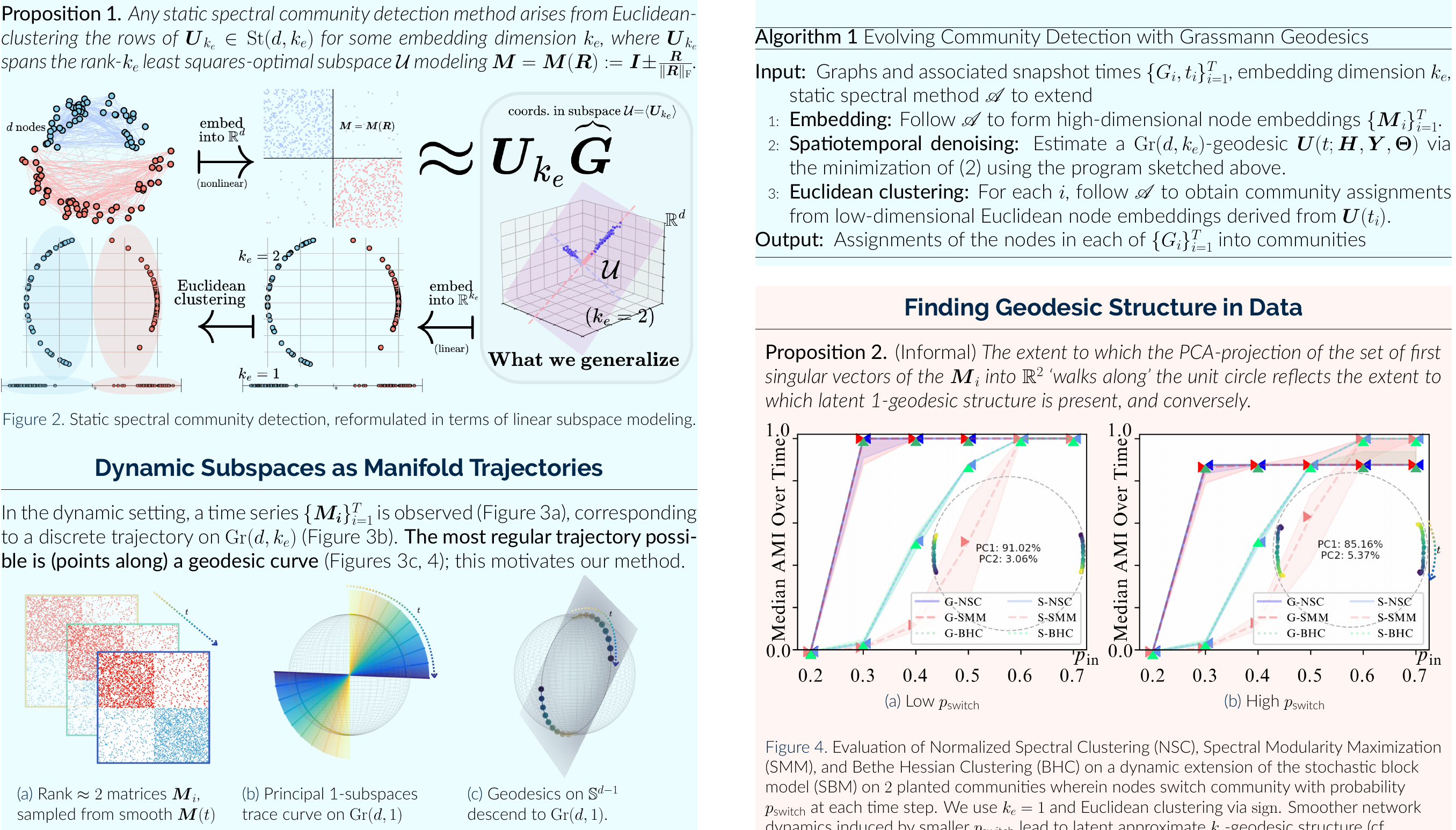 Abstract: Discovering and tracking communities in time-varying networks is an important task in network science, motivated by applications in fields ranging from neuroscience to sociology. In this work, we characterize the celebrated family of spectral methods for static clustering in terms of the low-rank approximation of high-dimensional node embeddings. From this perspective, it becomes natural to view the evolving community detection problem as one of subspace tracking on the Grassmann manifold. While the resulting optimization problem is nonconvex, we adopt a recently proposed block majorize-minimize Riemannian optimization scheme to learn the Grassmann geodesic which best fits the data. Our framework generalizes any static spectral community detection approach and leads to algorithms achieving favorable performance on synthetic and real temporal networks, including those that are weighted, signed, directed, mixed-membership, multiview, hierarchical, cocommunity-structured, bipartite, or some combination thereof. We demonstrate how to specifically cast a wide variety of methods into our framework, and demonstrate greatly improved dynamic community detection results in all cases.