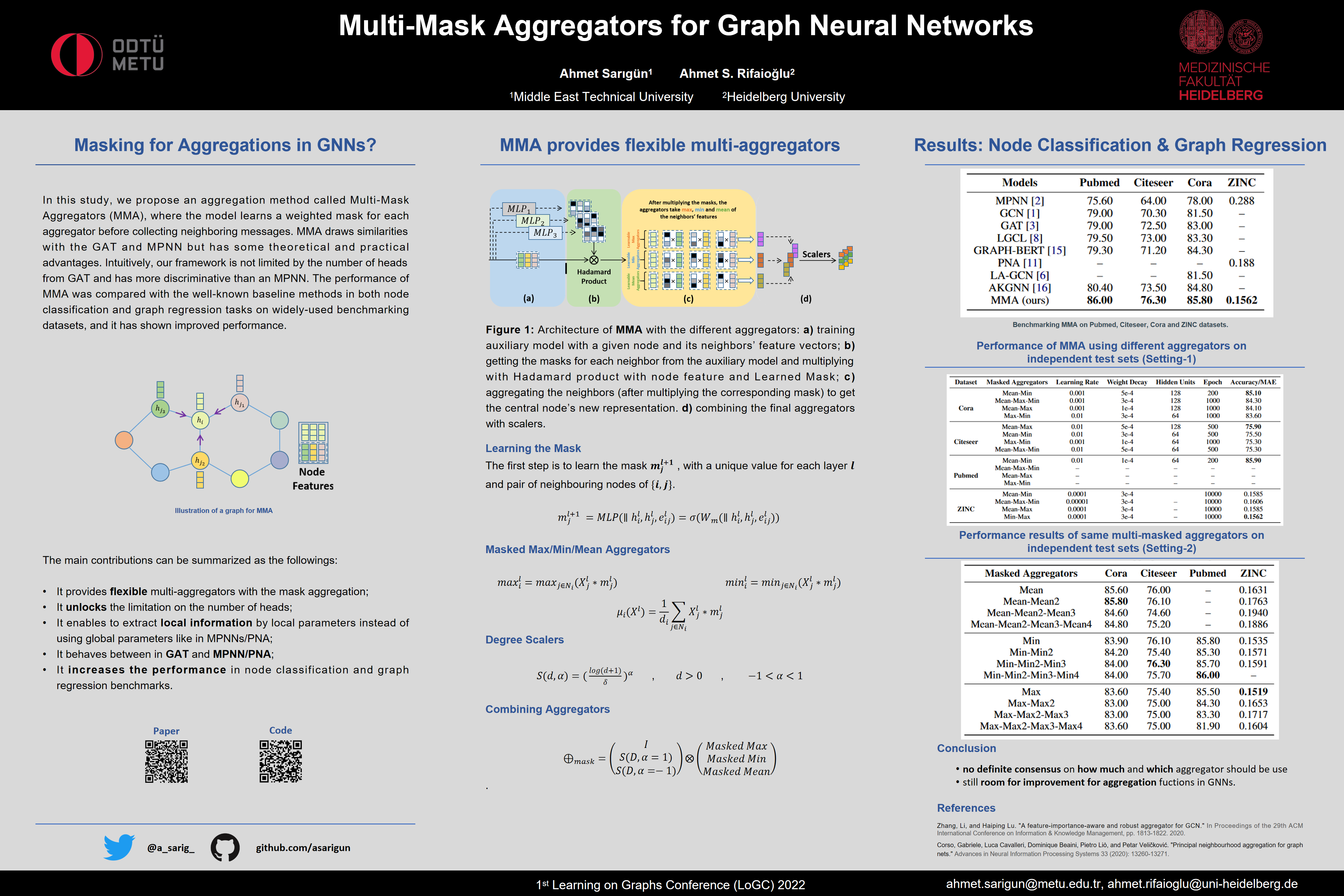 Abstract: One of the most critical operations in graph neural networks (GNNs) is the aggregation operation, which aims to extract information from neighbors of the target node. Several convolution methods have been proposed such as standard graph convolution (GCN), graph attention (GAT), and message passing (MPNN). In this study, we propose an aggregation method called Multi-Mask Aggregators (MMA), where the model learns a weighted mask for each aggregator before collecting neighboring messages. MMA draws similarities with the GAT and MPNN but has some theoretical and practical advantages. Intuitively, our framework is not limited by the number of heads from GAT and has more discriminative than an MPNN. The performance of MMA was compared with the well-known baseline methods in both node classification and graph regression tasks on widely-used benchmarking datasets, and it has shown improved performance. Dataset and codes are available at https://github.com/asarigun/mma.