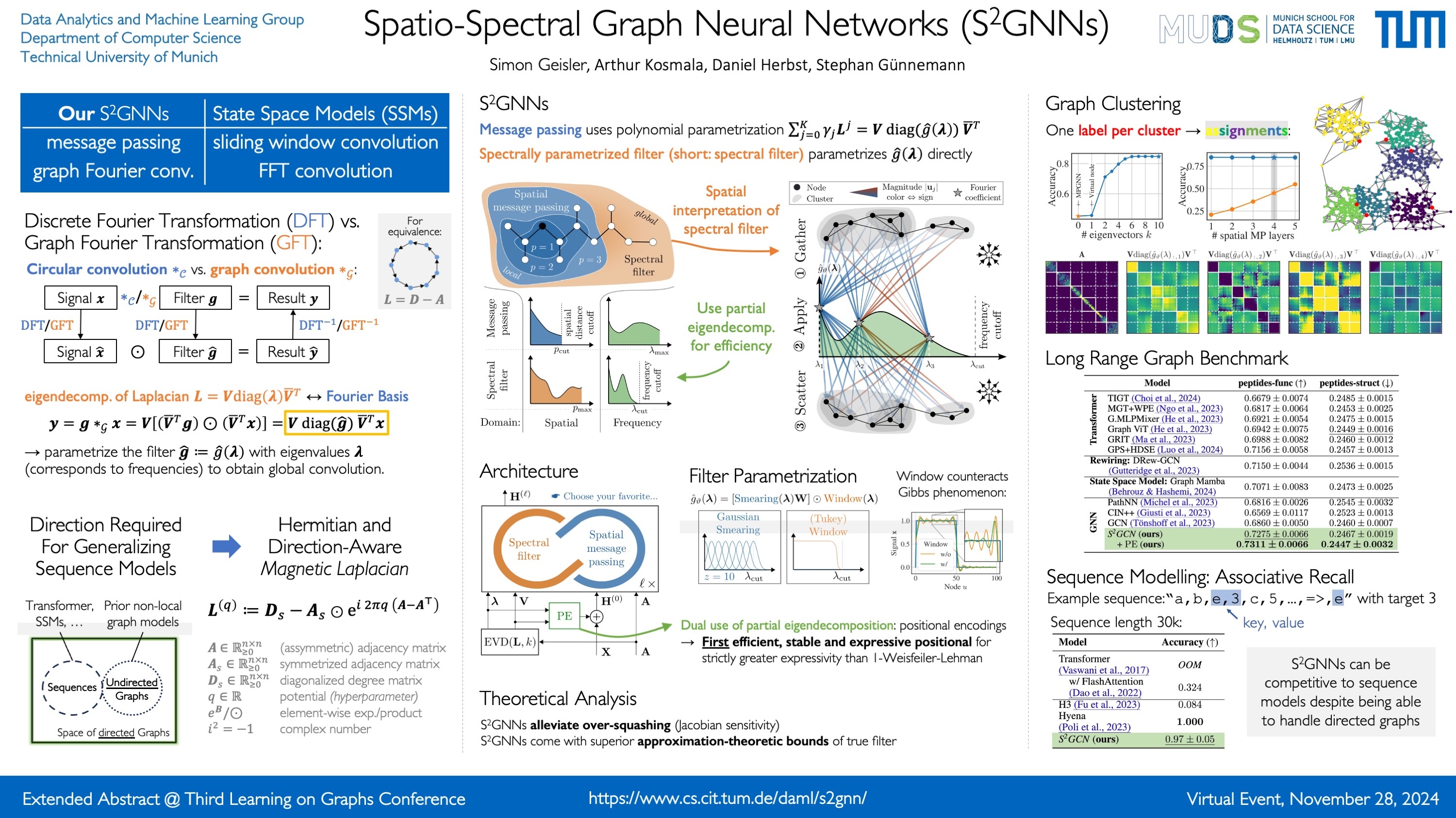 Abstract: Spatial Message Passing Graph Neural Networks (MPGNNs) are widely used for learning on graph-structured data. However, key limitations of ℓ-step MPGNNs are that their "receptive field" is typically limited to the ℓ-hop neighborhood of a node and that information exchange between distant nodes is limited by over-squashing. Motivated by these limitations, we propose Spatio-Spectral Graph Neural Networks (S²GNNs) – a new modeling paradigm for Graph Neural Networks (GNNs) that synergistically combines spatially and spectrally parametrized graph filters. Parameterizing filters partially in the frequency domain enables global yet efficient information propagation. We show that S²GNNs vanquish over-squashing and yield strictly tighter approximation-theoretic error bounds than MPGNNs. Further, rethinking graph convolutions at a fundamental level unlocks new design spaces. For example, S²GNNs allow for free positional encodings that make them strictly more expressive than the 1-Weisfeiler-Lehman (WL) test. Moreover, to obtain general-purpose S²GNNs, we propose spectrally parametrized filters for directed graphs. S²GNNs outperform spatial MPGNNs, graph transformers, and graph rewirings, e.g., on the peptide long-range benchmark tasks, and are competitive with state-of-the-art sequence modeling.