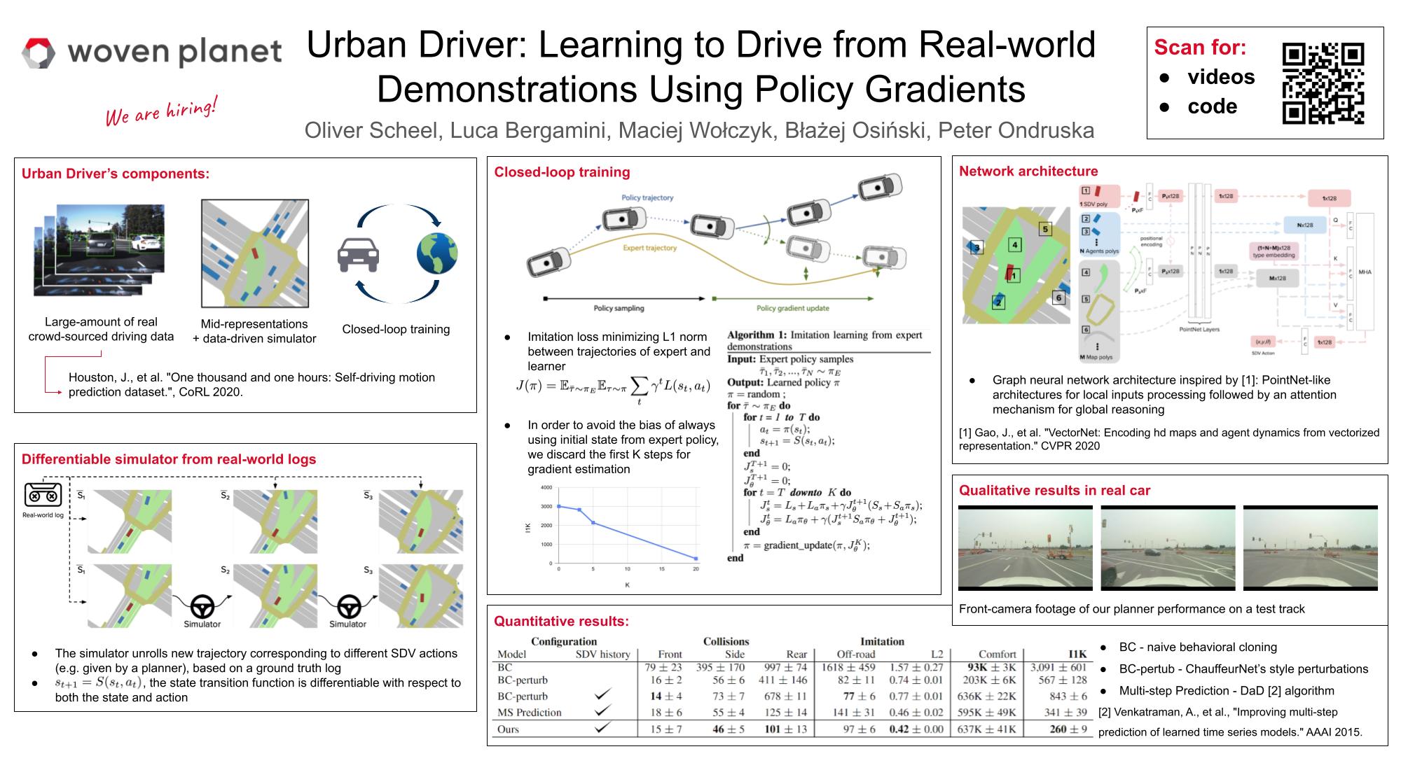 Abstract: In this work we are the first to present an offline policy gradient method for learning imitative policies for complex urban driving from a large corpus of real-world demonstrations. This is achieved by building a differentiable data-driven simulator on top of perception outputs and high-fidelity HD maps of the area. It allows us to synthesize new driving experiences from existing demonstrations using mid-level representations. Using this simulator we then train a policy network in closed-loop employing policy gradients.