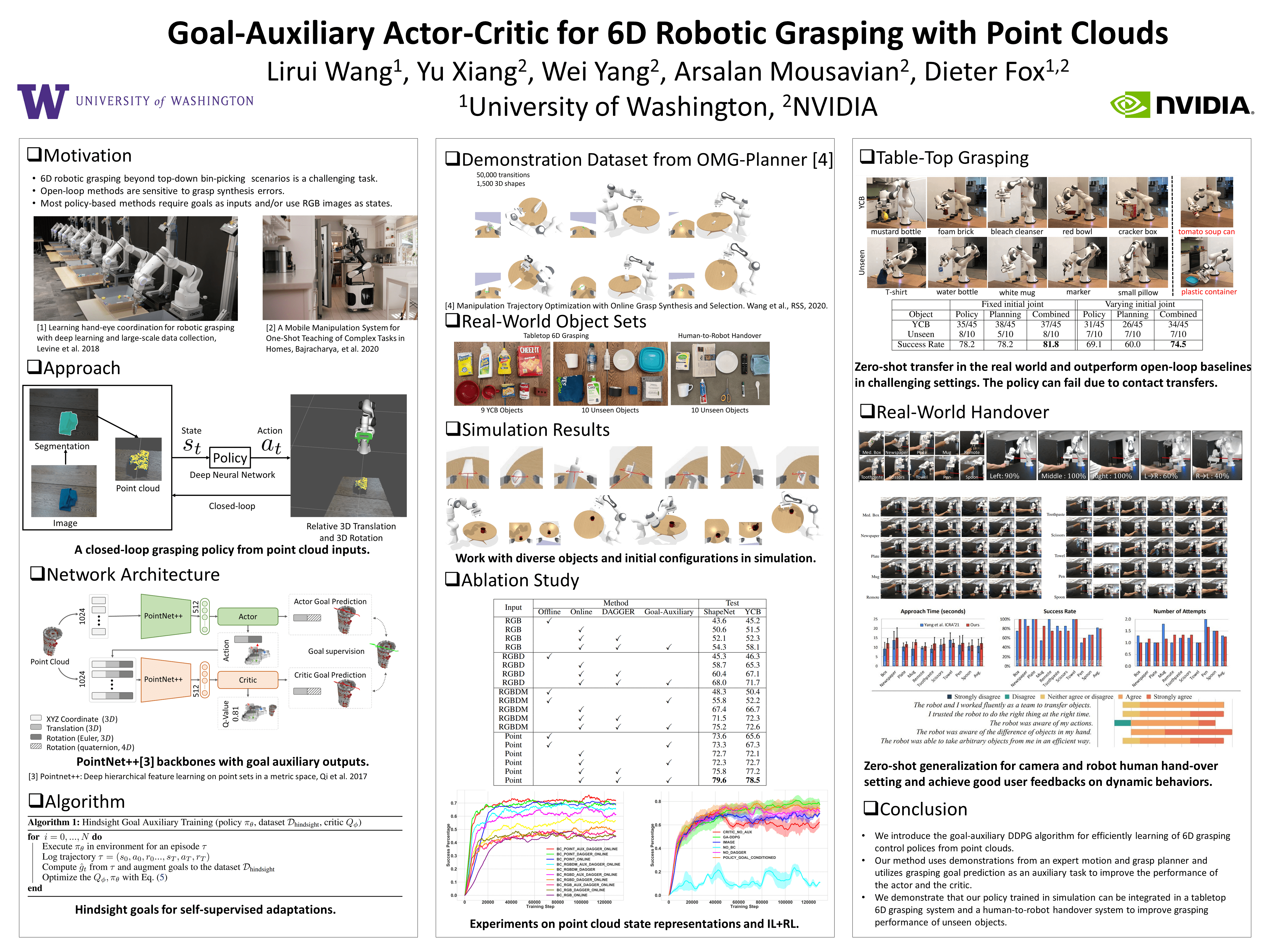 Abstract: 6D robotic grasping beyond top-down bin-picking scenarios is a challenging task. Previous solutions based on 6D grasp synthesis with robot motion planning usually operate in an open-loop setting, which are sensitive to grasp synthesis errors. In this work, we propose a new method for learning closed-loop control policies for 6D grasping. Our policy takes a segmented point cloud of an object from an egocentric camera as input, and outputs continuous 6D control actions of the robot gripper for grasping the object. We combine imitation learning and reinforcement learning and introduce a goal-auxiliary actor-critic algorithm for policy learning. We demonstrate that our learned policy can be integrated into a tabletop 6D grasping system and a human-robot handover system to improve the grasping performance of unseen objects. Videos and code are available at https://sites.google.com/view/gaddpg.