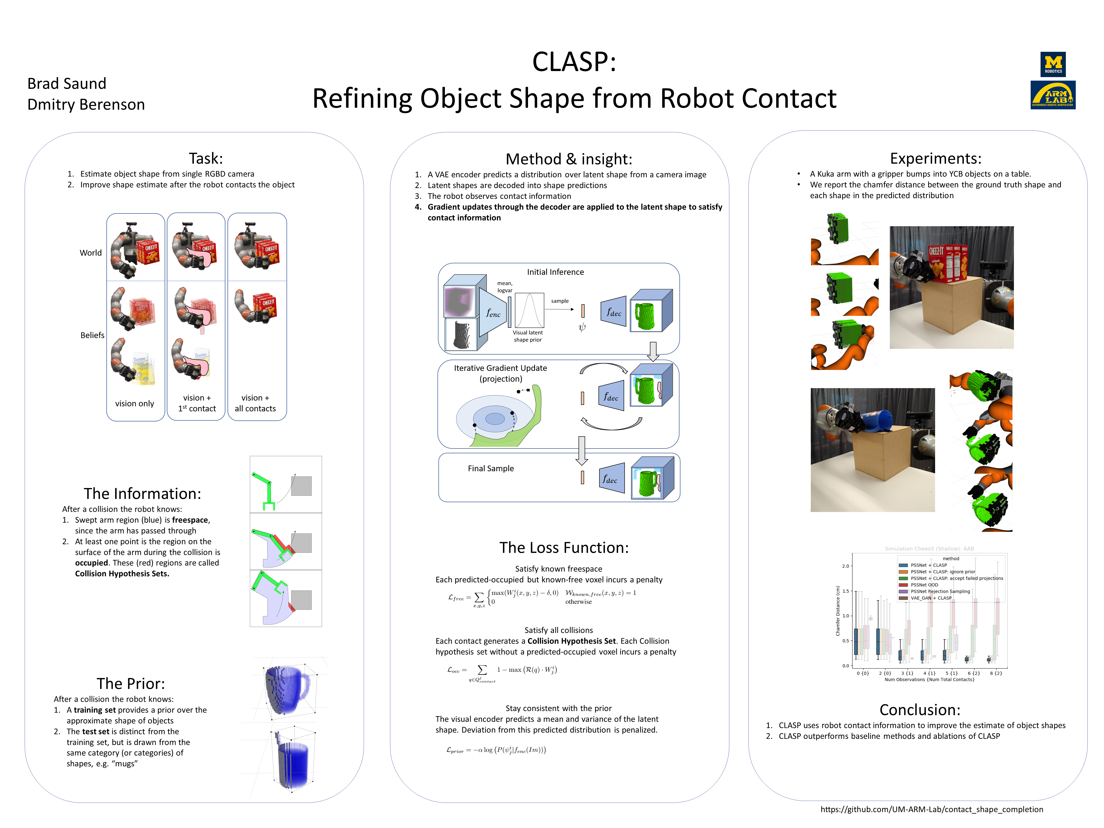 Abstract: Robots need both visual and contact sensing to effectively estimate the state of their environment. Camera RGBD data provides rich information of the objects surrounding the robot, and shape priors can help correct noise and fill in gaps and occluded regions. However, when the robot senses unexpected contact, the estimate should be updated to explain the contact. To address this need, we propose CLASP: Constrained Latent Shape Projection. This approach consists of a shape completion network that generates a prior from RGBD data and a procedure to generate shapes consistent with both the network prior and robot contact observations. We find CLASP consistently decreases the Chamfer Distance between the predicted and ground truth scenes, while other approaches do not benefit from contact information.