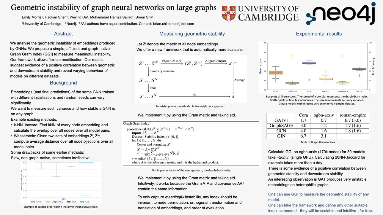Abstract: We analyse the geometric instability of embeddings produced by graph neural networks (GNNs). Existing methods are only applicable for small graphs and lack context in the graph domain. We propose a simple, efficient and graph-native Graph Gram Index (GGI) to measure such instability which is invariant to permutation, orthogonal transformation, translation and order of evaluation. This allows us to study the varying instability behaviour of GNN embeddings on large graphs for both node classification and link prediction.