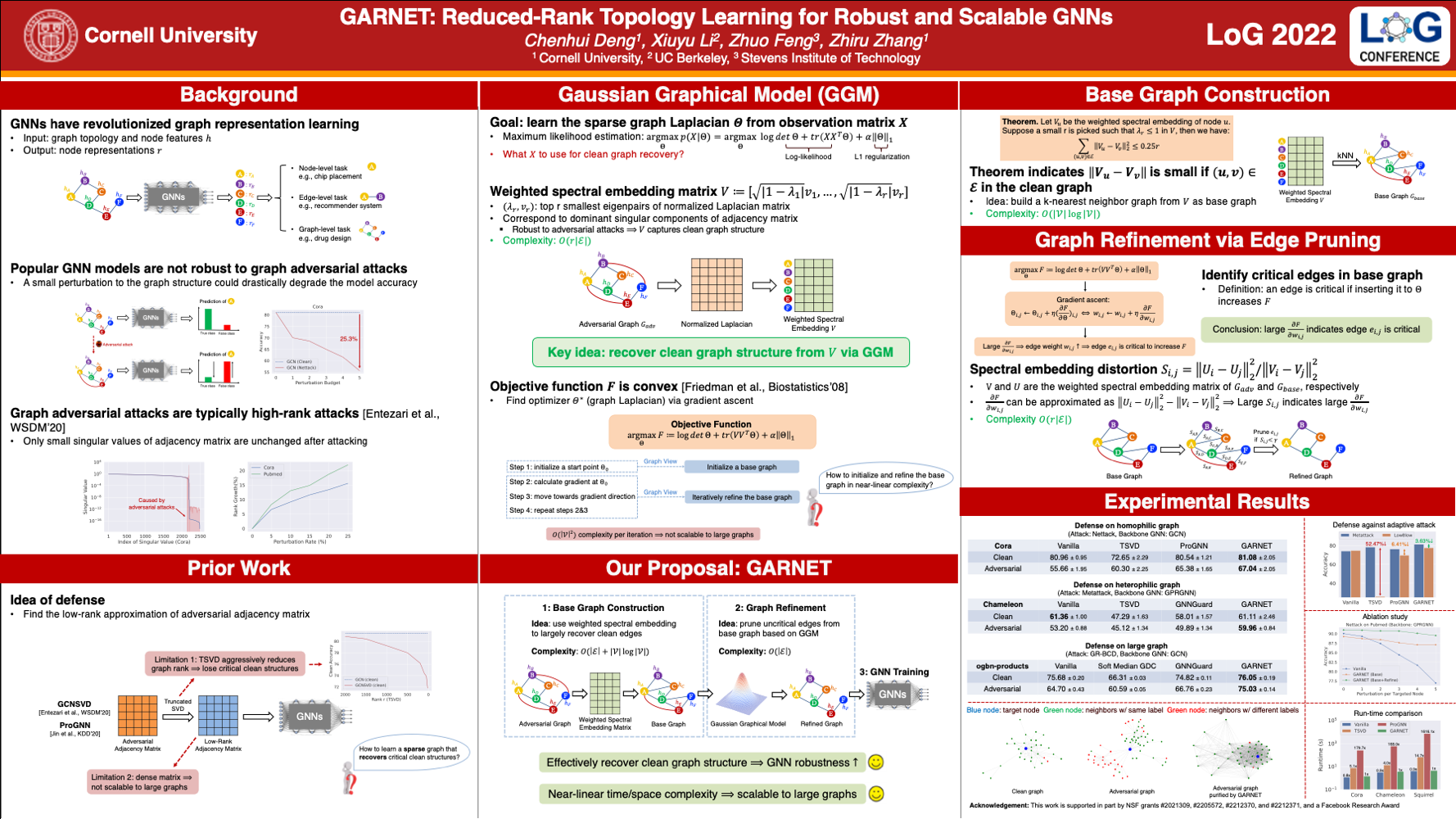 Abstract: Graph neural networks (GNNs) have been increasingly deployed in various applications that involve learning on non-Euclidean data. However, recent studies show that GNNs are vulnerable to graph adversarial attacks. Although there are several defense methods to improve GNN robustness by eliminating adversarial components, they may also impair the underlying clean graph structure that contributes to GNN training. In addition, few of those defense models can scale to large graphs due to their high computational complexity and memory usage. In this paper, we propose GARNET, a scalable spectral method to boost the adversarial robustness of GNN models. GARNET first leverages weighted spectral embedding to construct a base graph, which is not only resistant to adversarial attacks but also contains critical (clean) graph structure for GNN training. Next, GARNET further refines the base graph by pruning additional uncritical edges based on probabilistic graphical model. GARNET has been evaluated on various datasets, including a large graph with millions of nodes. Our extensive experiment results show that GARNET achieves adversarial accuracy improvement and runtime speedup over state-of-the-art GNN (defense) models by up to $10.23\%$ and $14.7\times$, respectively.