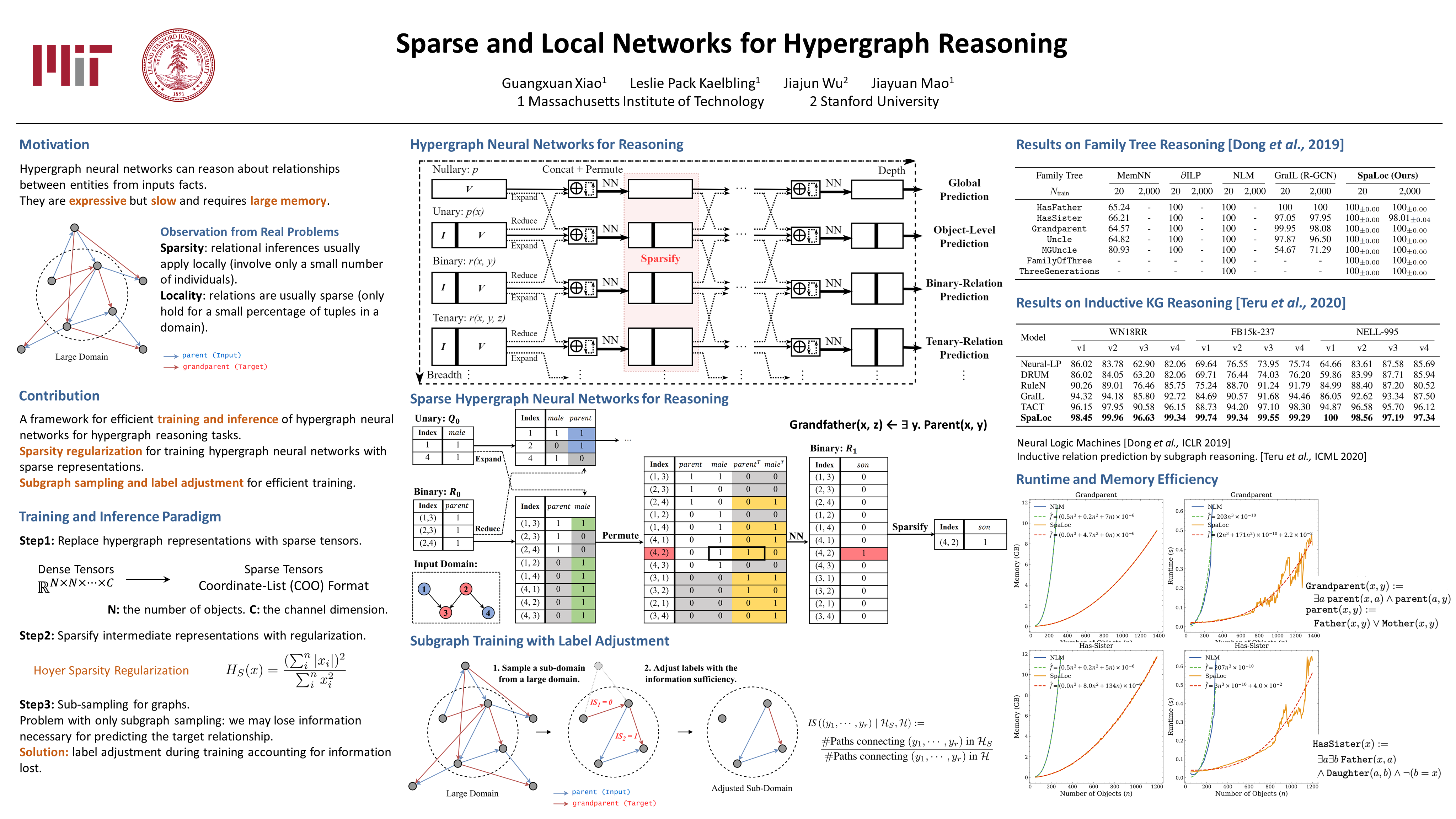 Abstract: Reasoning about the relationships between entities from input facts (e.g., whether Ari is a grandparent of Charlie) generally requires explicit consideration of other entities that are not mentioned in the query (e.g., the parents of Charlie). In this paper, we present an approach for learning to solve problems of this kind in large, real-world domains, using sparse and local hypergraph neural networks (SpaLoc). SpaLoc is motivated by two observations from traditional logic-based reasoning: relational inferences usually apply locally (i.e., involve only a small number of individuals), and relations are usually sparse (i.e., only hold for a small percentage of tuples in a domain). We exploit these properties to make learning and inference efficient in very large domains by (1) using a sparse tensor representation for hypergraph neural networks, (2) applying a sparsification loss during training to encourage sparse representations, and (3) subsampling based on a novel information sufficiency–based sampling process during training. SpaLoc achieves state-of-the-art performance on several real-world, large-scale knowledge graph reasoning benchmarks, and is the first framework for applying hypergraph neural networks on real-world knowledge graphs with more than 10k nodes.