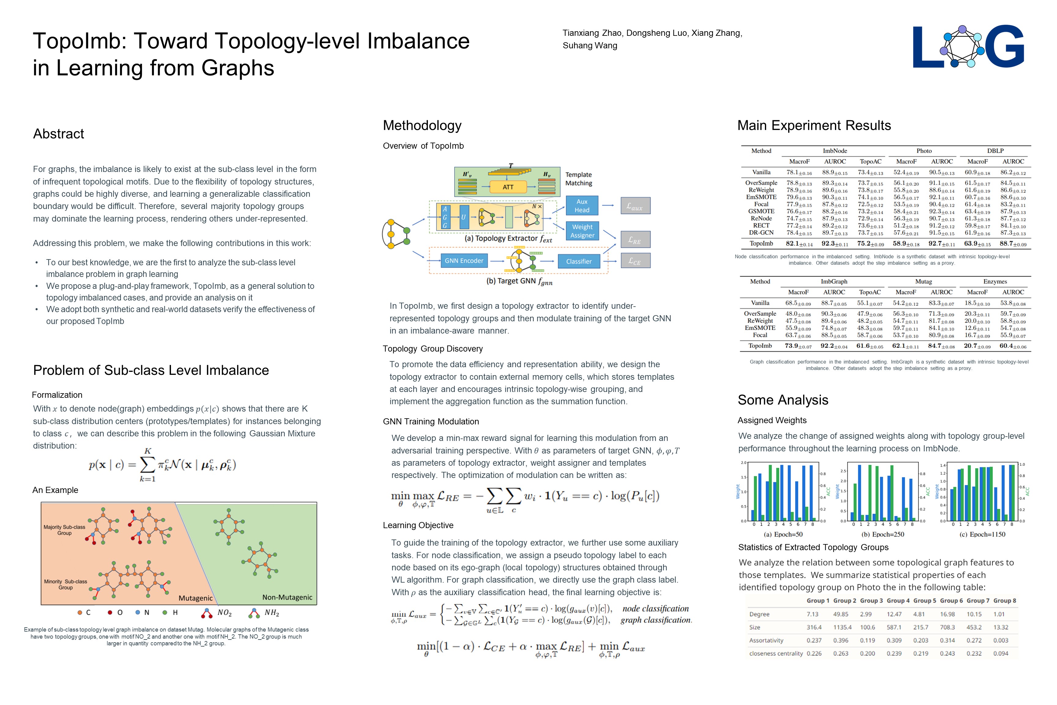 Abstract: Graph serves as a powerful tool for modeling data that has an underlying structure in non-Euclidean space, by encoding relations as edges and entities as nodes. Despite developments in learning from graph-structured data over the years, one obstacle persists: graph imbalance. Although several attempts have been made to target this problem, they are limited to considering only class-level imbalance. In this work, we argue that for graphs, the imbalance is likely to exist at the sub-class topology group level. Due to the flexibility of topology structures, graphs could be highly diverse, and learning a generalizable classification boundary would be difficult. Therefore, several majority topology groups may dominate the learning process, rendering others under-represented. To address this problem, we propose a new framework {\method} and design (1 a topology extractor, which automatically identifies the topology group for each instance with explicit memory cells, (2 a training modulator, which modulates the learning process of the target GNN model to prevent the case of topology-group-wise under-representation. {\method} can be used as a key component in GNN models to improve their performances under the data imbalance setting. Analyses on both topology-level imbalance and the proposed {\method} are provided theoretically, and we empirically verify its effectiveness with both node-level and graph-level classification as the target tasks.