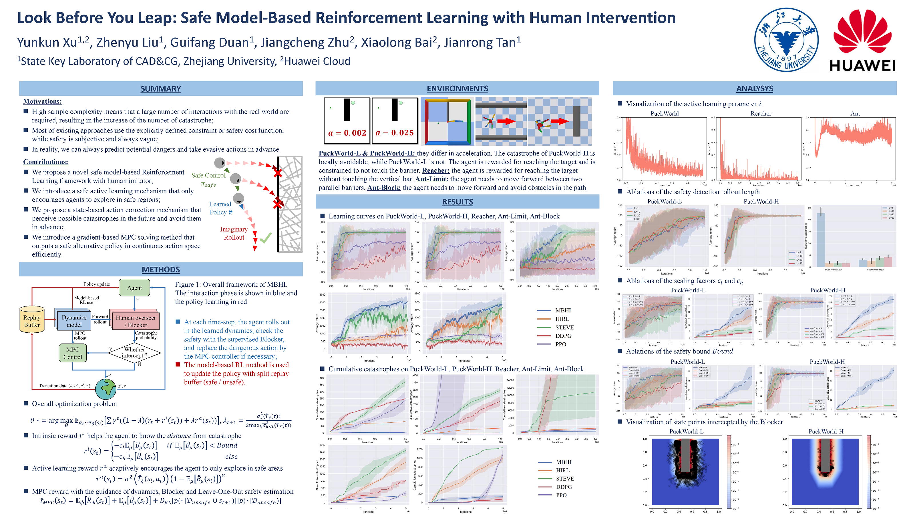 Abstract: Safety has become one of the main challenges of applying deep reinforcement learning to real world systems. Currently, the incorporation of external knowledge such as human oversight is the only means to prevent the agent from visiting the catastrophic state. In this paper, we propose MBHI, a novel framework for safe model-based reinforcement learning, which ensures safety in the state-level and can effectively avoid both local and non-local catastrophes. An ensemble of supervised learners are trained in MBHI to imitate human blocking decisions. Similar to human decision-making process, MBHI will roll out an imagined trajectory in the dynamics model before executing actions to the environment, and estimate its safety. When the imagination encounters a catastrophe, MBHI will block the current action and use an efficient MPC method to output a safety policy. We evaluate our method on several safety tasks, and the results show that MBHI achieved better performance in terms of sample efficiency and number of catastrophes compared to the baselines.