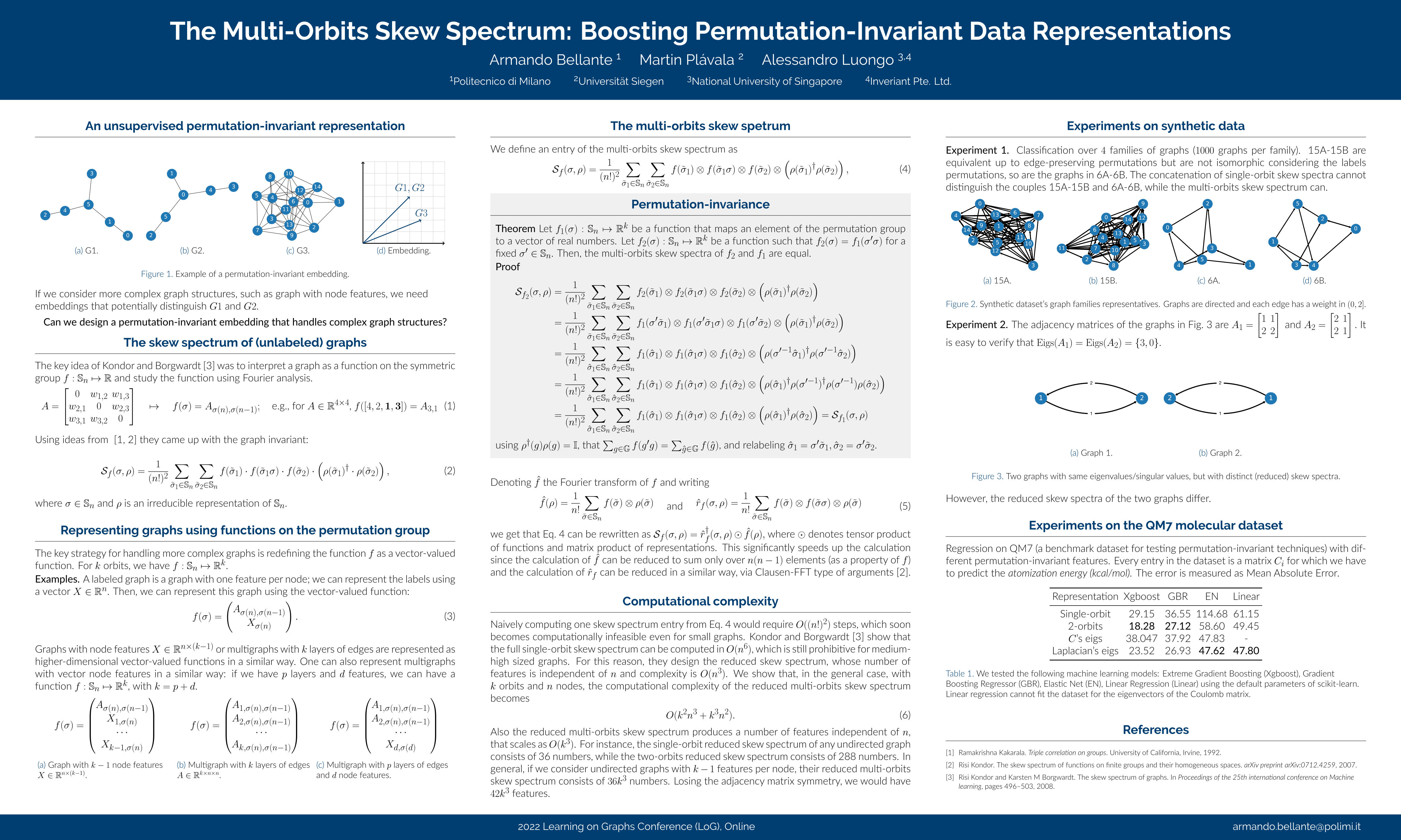 Abstract: We generalize the concept of skew spectrum of a graph, a group-theoretical permutation-invariant feature mapping. The skew spectrum considers adjacency matrices as functions over $\mathbb{S}_n$ and leverages Fourier transform and group-theoretical tools to extract features that are invariant under the group action. The main shortcoming of the previous result is that the skew spectrum only works for unlabeled graphs. The reason is that these graphs can be represented using matrices whose main diagonal contains zeros, meaning that there is only one set of elements that can permute among themselves (i.e., one orbit). However, the representations of more complex graphs (e.g., labeled graphs, multigraphs, or hypergraphs) have different sets of elements that can consistently permute on different orbits. In this work, we generalize the skew spectrum to the multiple orbits case. Our multi-orbits skew spectrum produces features invariant to such permutations and possibly informative of non-consistent ones. We show this method can improve the performances of models that learn on graphs by providing comparisons with single orbit representations and eigenvalues. Moreover, the theory is general enough to handle invariance under the action of any finite group on multiple orbits and has applications beyond the graph domain.