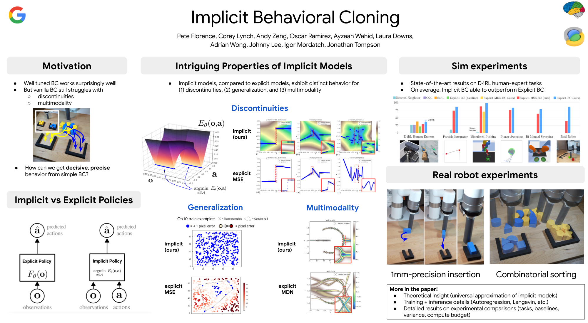 Abstract: We find that across a wide range of robot policy learning scenarios, treating supervised policy learning with an implicit model generally performs better, on average, than commonly used explicit models. We present extensive experiments on this finding, and we provide both intuitive insight and theoretical arguments distinguishing the properties of implicit models compared to their explicit counterparts, particularly with respect to approximating complex, potentially discontinuous and multi-valued (set-valued) functions. On robotic policy learning tasks we show that implicit behavior-cloning policies with energy-based models (EBM) often outperform common explicit (Mean Square Error, or Mixture Density) behavior-cloning policies, including on tasks with high-dimensional action spaces and visual image inputs. We find these policies provide competitive results or outperform state-of-the-art offline reinforcement learning methods on the challenging human-expert tasks from the D4RL benchmark suite, despite using no reward information. In the real world, robots with implicit policies can learn complex and remarkably subtle behaviors on contact-rich tasks from human demonstrations, including tasks with high combinatorial complexity and tasks requiring 1mm precision.
