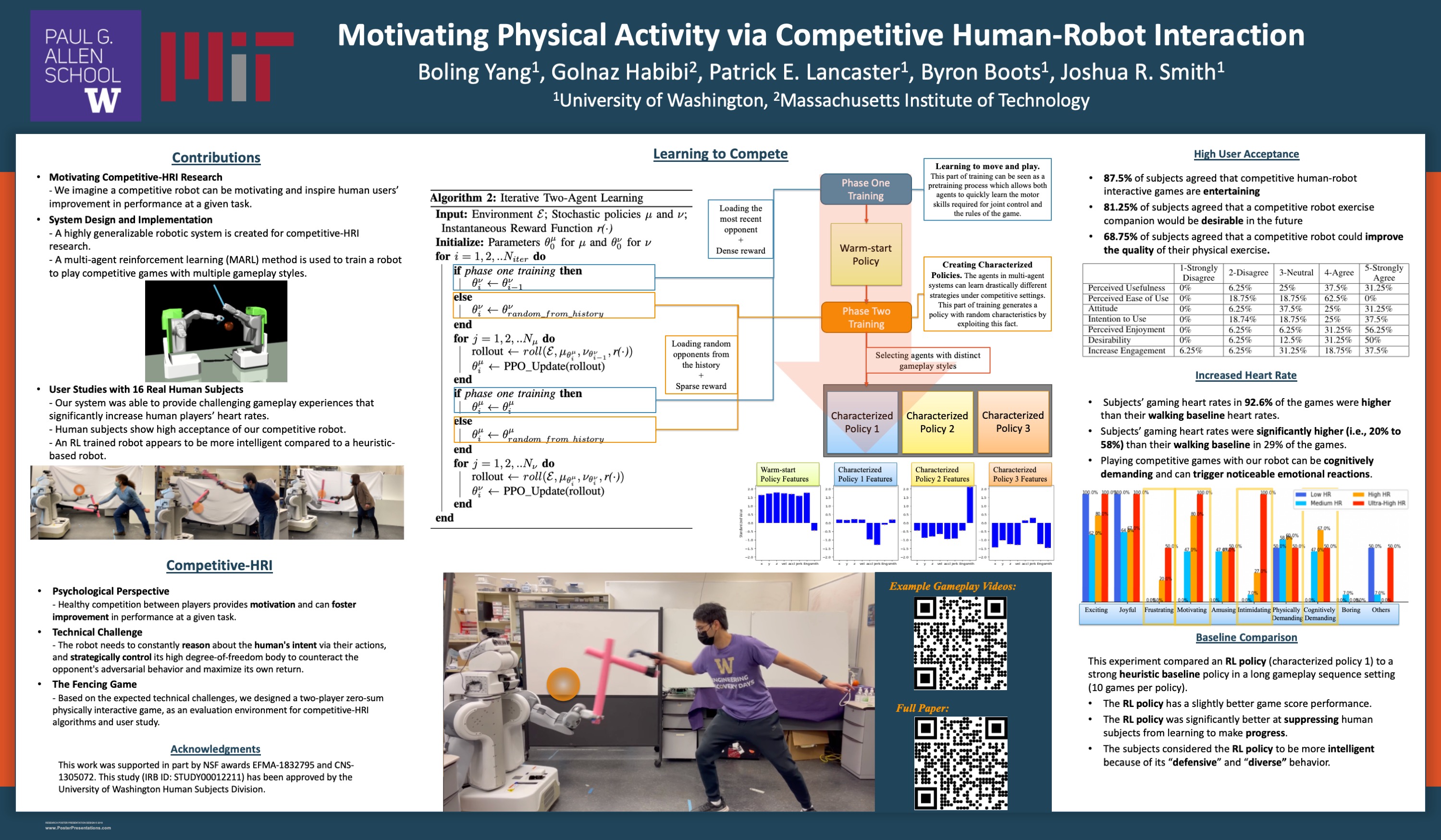 Abstract: This project aims to motivate research in competitive human-robot interaction by creating a robot competitor that can challenge human users in certain scenarios such as physical exercise and games. With this goal in mind, we introduce the Fencing Game, a human-robot competition used to evaluate both the capabilities of the robot competitor and user experience. We develop the robot competitor through iterative multi-agent reinforcement learning and show that it can perform well against human competitors. Our user study additionally found that our system was able to continuously create challenging and enjoyable interactions that significantly increased human subjects' heart rates. The majority of human subjects considered the system to be entertaining and desirable for improving the quality of their exercise.