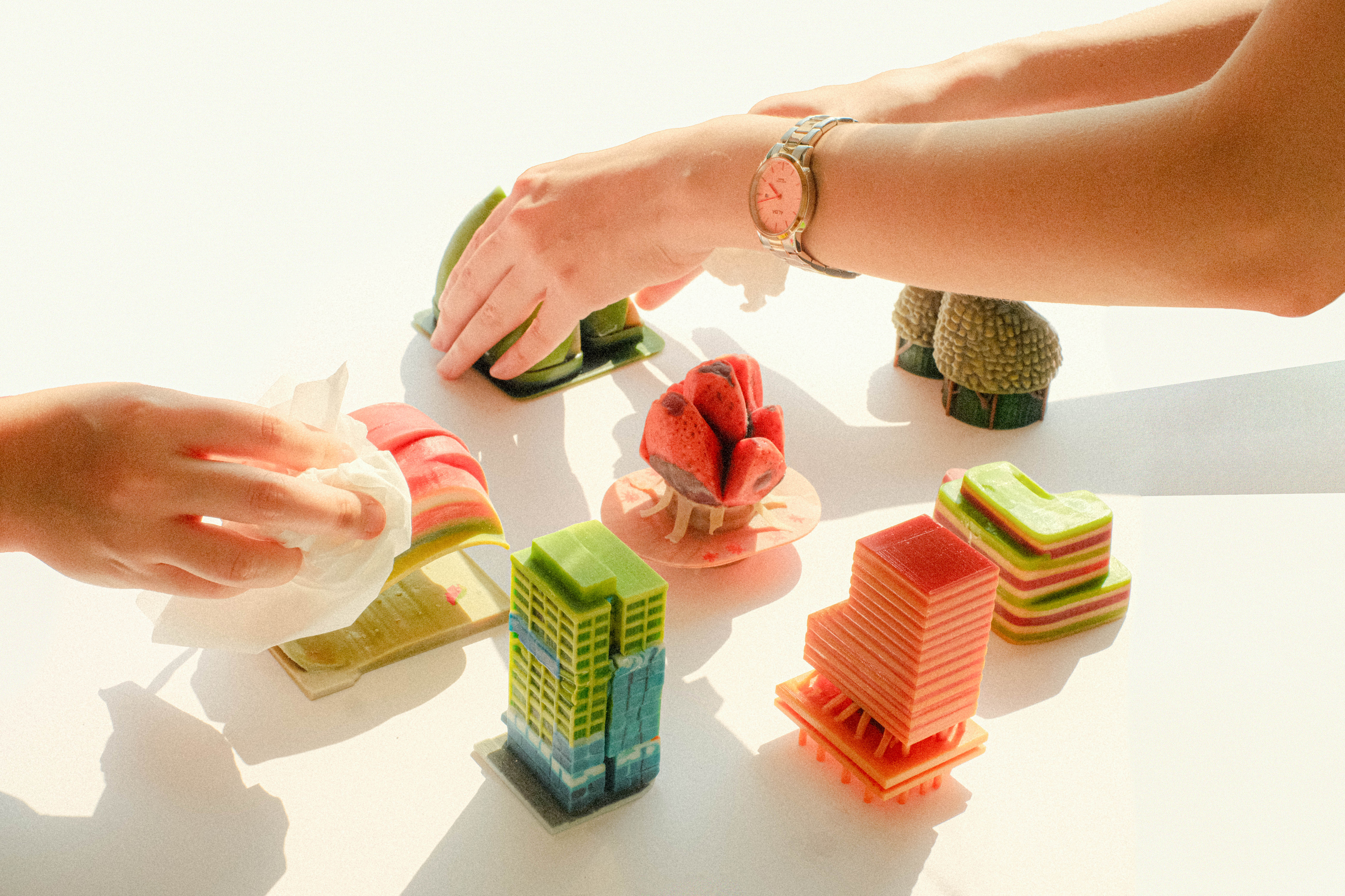 The project features the outputs as 3D-printed architectural pieces in several food scales and 3D point clouds video animations in several urban scales. Neural Palate Kueh proposes an experimental AI methodology driven by architectural narrative and gastrophysics – perhaps like ‘a house is a machine for eating in’. In fact, as part of the project, EEG (electroencephalogram) and eye-tracking measurements have been recoded to quantitatively understand the perceptual correlation between the kuehs and their architectural proxies; thus not simply re‐creating forms, but proposing a new mode of architectural design that leverages the brain’s inherent cross-modal and multi-sensorial associations.