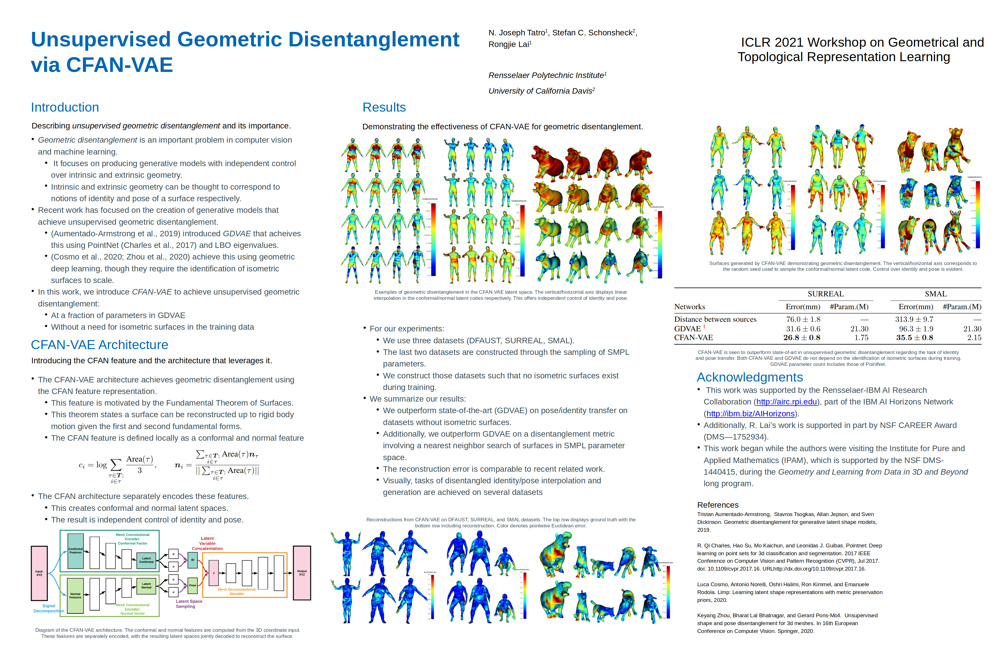 Abstract: Geometric disentanglement, the separation of latent codes for intrinsic (i.e. identity) and extrinsic (i.e. pose) geometry, is a prominent task for generative models of non-Euclidean data such as 3D deformable models. It provides greater interpretability of the latent space, and leads to more control in generation. This work introduces a mesh feature, the conformal factor and normal feature (CFAN), for use in mesh convolutional autoencoders. We further propose CFAN-VAE, a novel architecture that disentangles identity and pose using the CFAN feature. Requiring no label information on the identity or pose during training, CFAN-VAE achieves geometric disentanglement in an unsupervised way. Our comprehensive experiments, including reconstruction, interpolation, generation, and identity/pose transfer, demonstrate CFAN-VAE achieves state-of-the-art performance on unsupervised geometric disentanglement.