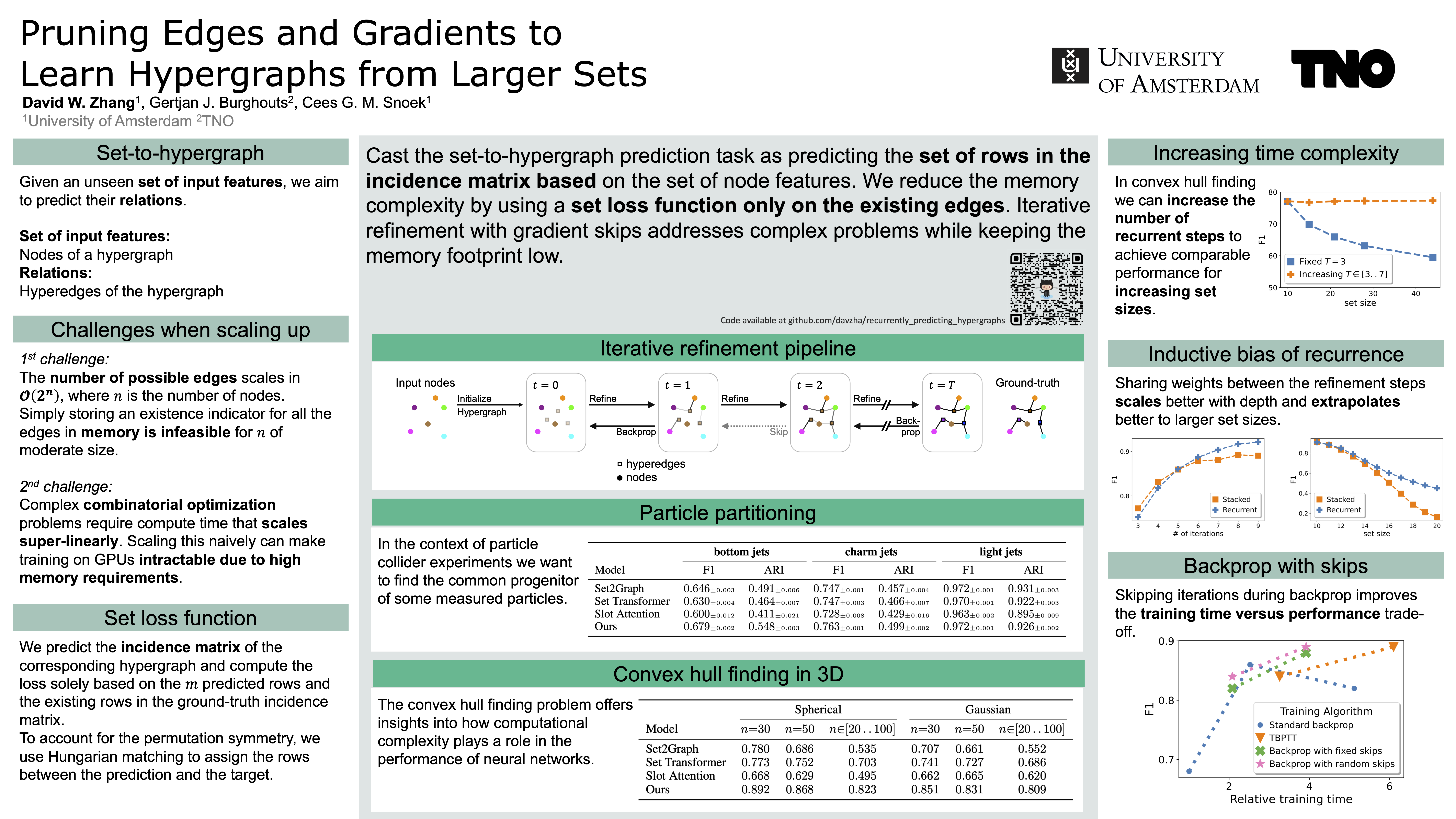 Abstract: This paper aims for set-to-hypergraph prediction, where the goal is to infer the set of relations for a given set of entities. This is a common abstraction for applications in particle physics, biological systems and combinatorial optimization. We address two common scaling problems encountered in set-to-hypergraph tasks that limit the size of the input set: the exponentially growing number of hyperedges and the run-time complexity, both leading to higher memory requirements. We make three contributions. First, we propose to predict and supervise the positive edges only, which changes the asymptotic memory scaling from exponential to linear. Second, we introduce a training method that encourages iterative refinement of the predicted hypergraph, which allows us to skip iterations in the backward pass for improved efficiency and constant memory usage. Third, we combine both contributions in a single set-to-hypergraph model that enables us to address problems with larger input set sizes. We provide ablations for our main technical contributions and show that our model outperforms prior state-of-the-art, especially for larger sets.