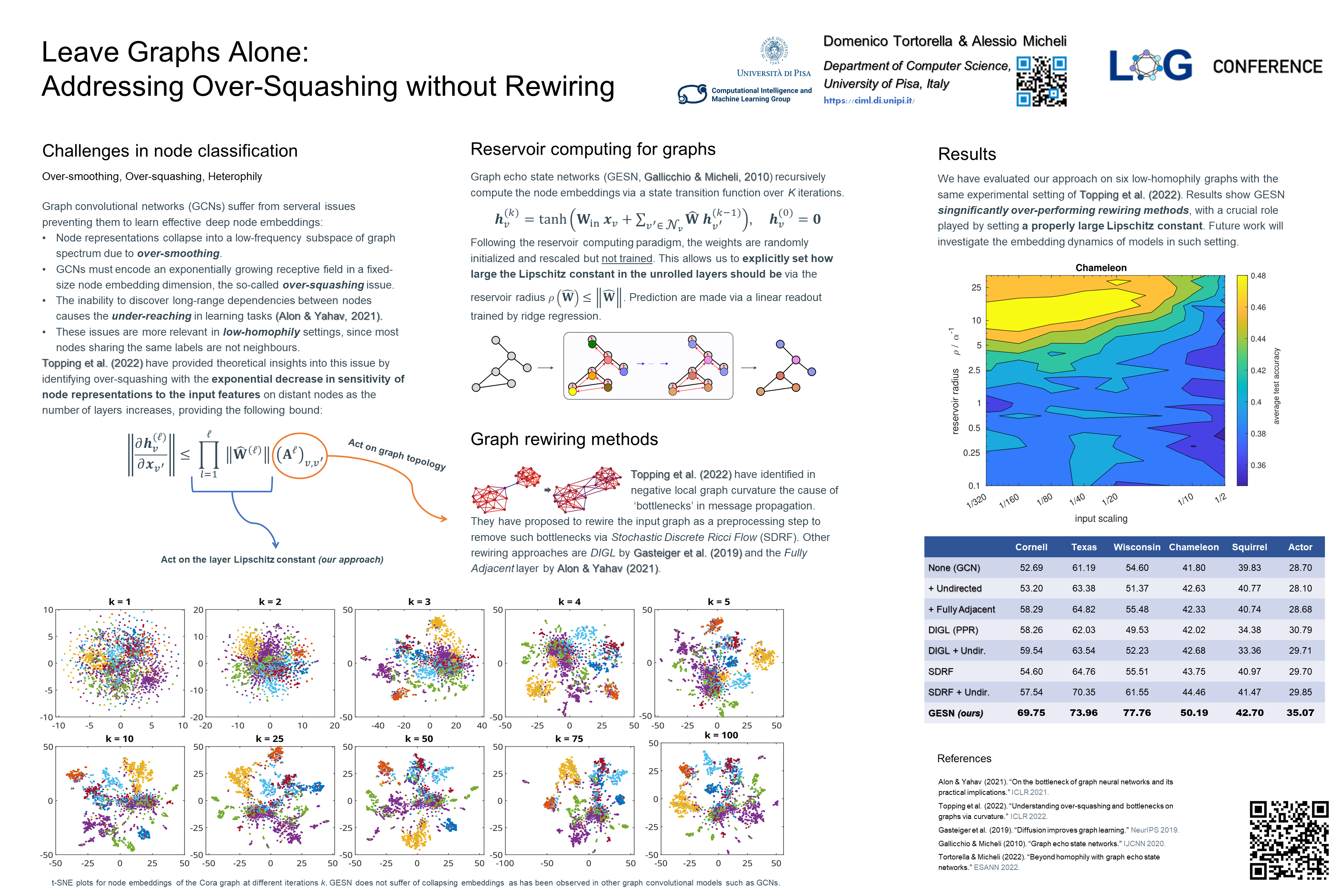 Abstract: Recent works have investigated the role of graph bottlenecks in preventing long-range information propagation in message-passing graph neural networks, causing the so-called `over-squashing' phenomenon. As a remedy, graph rewiring mechanisms have been proposed as preprocessing steps. Graph Echo State Networks (GESNs) are a reservoir computing model for graphs, where node embeddings are recursively computed by an untrained message-passing function. In this paper, we show that GESNs can achieve a significantly better accuracy on six heterophilic node classification tasks without altering the graph connectivity, thus suggesting a different route for addressing the over-squashing problem.