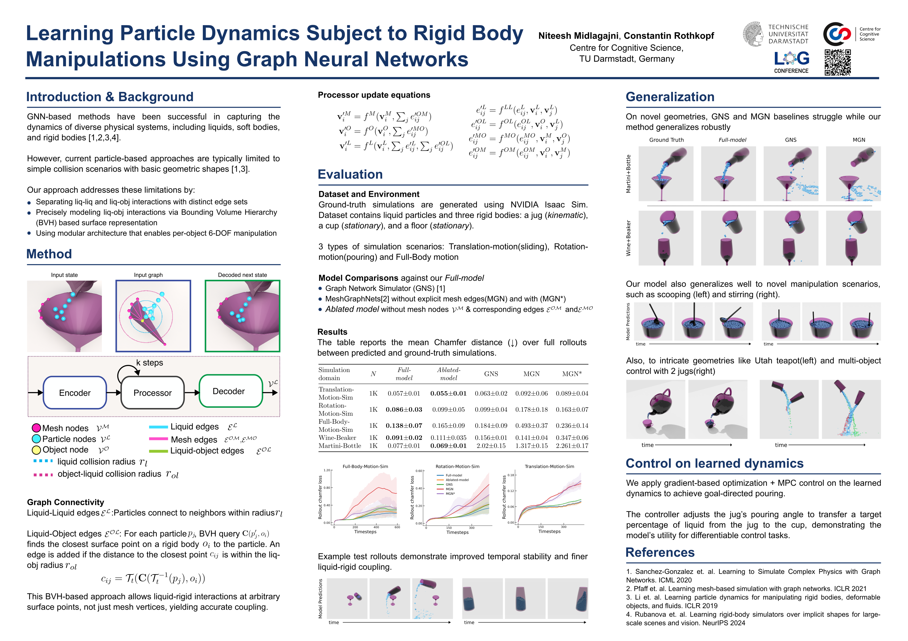 Abstract: Simulating particle dynamics with high fidelity is crucial for solving real-world interaction and control tasks involving liquids in design, graphics, and robotics. Recently, data-driven approaches, particularly those based on graph neural networks (GNNs), have shown progress in tackling such problems. However, these approaches are often limited to learning fluid behavior in static free-fall environments or simple manipulation settings involving primitive objects, often overlooking complex interactions with dynamically moving kinematic rigid bodies. Here, we propose a GNN-based framework designed from the ground up to learn the dynamics of liquids under rigid body interactions and active manipulations, where particles are represented as graph nodes and particle-object collisions are handled using surface representations with the bounding volume hierarchy (BVH) algorithm. Our approach accurately captures fluid behavior in dynamic settings and can also function as a simulator in static free-fall environments. Despite being trained on single-object manipulation tasks, our model generalizes effectively to environments with novel objects and novel manipulation tasks. Finally, we show that the learned dynamics can be leveraged to solve control and manipulation tasks using gradient-based optimization methods.