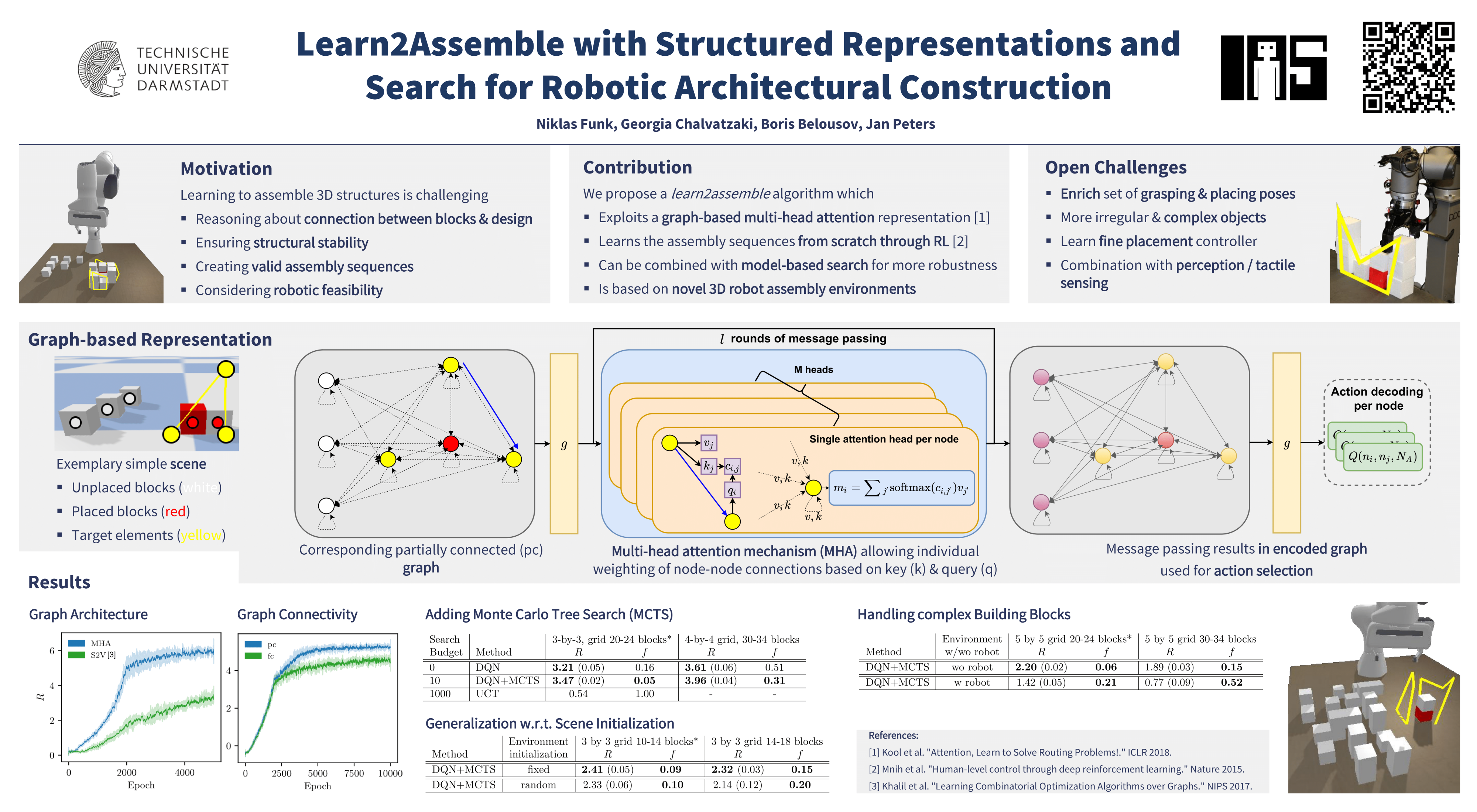 Abstract: Autonomous robotic assembly requires a well-orchestrated sequence of high-level actions and smooth manipulation executions. Learning to assemble complex 3D structures remains a challenging problem that requires drawing connections between target designs and building blocks, and creating valid assembly sequences considering structural stability and feasibility. To address the combinatorial complexity of the assembly tasks, we propose a multi-head attention graph representation that can be trained with reinforcement learning (RL) to encode the spatial relations and provide meaningful assembly actions. Combining structured representations with model-free RL and Monte-Carlo planning allows agents to operate with various target shapes and building block types. We design a hierarchical control framework that learns to sequence the building blocks to construct arbitrary 3D designs and ensures their feasibility, as we plan the geometric execution with the robot-in-the-loop. We demonstrate the flexibility of the proposed structured representation and our algorithmic solution in a series of simulated 3D assembly tasks with robotic evaluation, which showcases our method's ability to learn to construct stable structures with a large number of building blocks. Code and videos are available at: https://sites.google.com/view/learn2assemble
