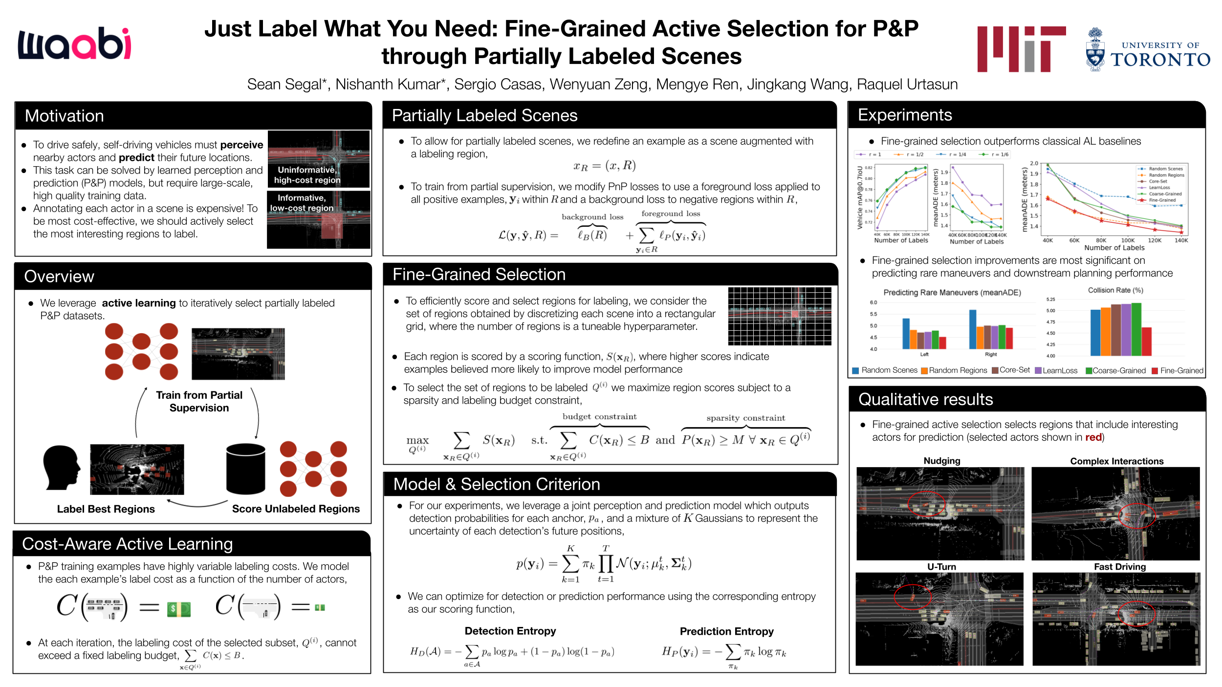 Abstract: Self-driving vehicles must perceive and predict the future positions of nearby actors to avoid collisions and drive safely. A deep learning module is often responsible for this task, requiring large-scale, high-quality training datasets. Due to high labeling costs, active learning approaches are an appealing solution to maximizing model performance for a given labeling budget. However, despite its appeal, there has been little scientific analysis of active learning approaches for the perception and prediction (P&P) problem. In this work, we study active learning techniques for P&P and find that the traditional active learning formulation is ill-suited. We thus introduce generalizations that ensure that our approach is both cost-aware and allows for fine-grained selection of examples through partially labeled scenes. Extensive experiments on a real-world dataset suggest significant improvements across perception, prediction, and downstream planning tasks.