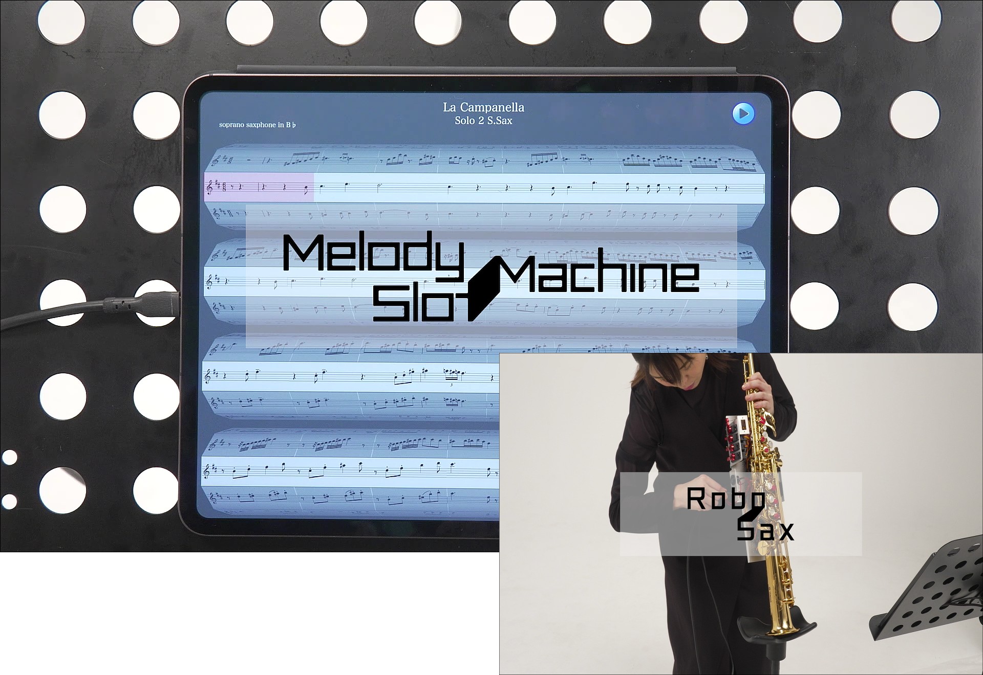 Abstract: Melody Slot Machine is a dial with the staves of music displayed on an iPad, which can be rotated to change the melody variations. The melody variations are generated on the basis of the AI-based melody-morphing method and can be partially switched to another variation without any significant change in the overall melody structure and with no musical breakdown. The microcomputer on the Automatic Fingering Saxophone receives the MIDI note from Melody Slot Machine and moves the servomotor so that the fingering corresponds to the note number.