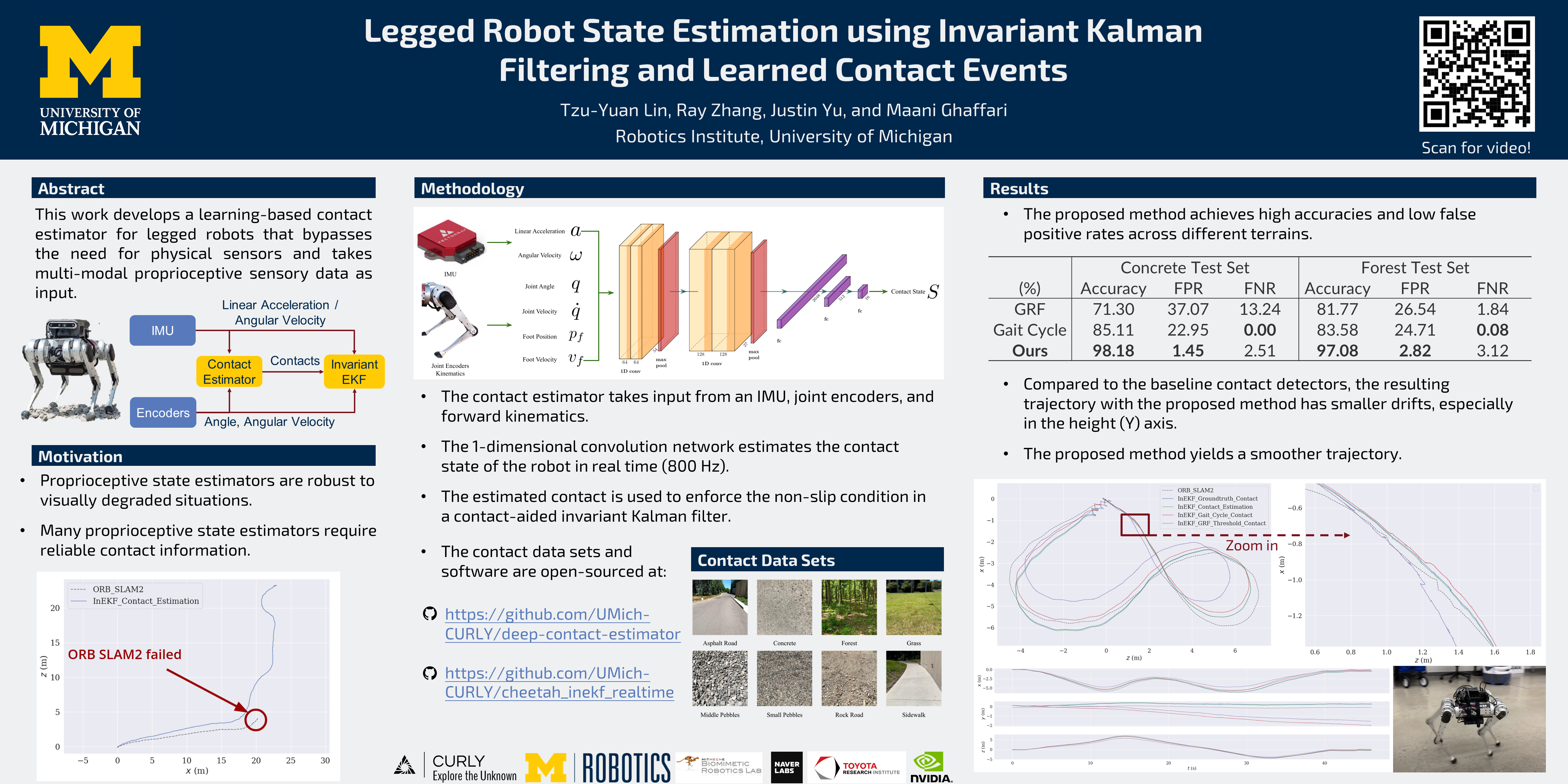 Abstract: This work develops a learning-based contact estimator for legged robots that bypasses the need for physical sensors and takes multi-modal proprioceptive sensory data as input. Unlike vision-based state estimators, proprioceptive state estimators are agnostic to perceptually degraded situations such as dark or foggy scenes. While some robots are equipped with dedicated physical sensors to detect necessary contact data for state estimation, some robots do not have dedicated contact sensors, and the addition of such sensors is non-trivial without redesigning the hardware. The trained network can estimate contact events on different terrains. The experiments show that a contact-aided invariant extended Kalman filter can generate accurate odometry trajectories compared to a state-of-the-art visual SLAM system, enabling robust proprioceptive odometry.