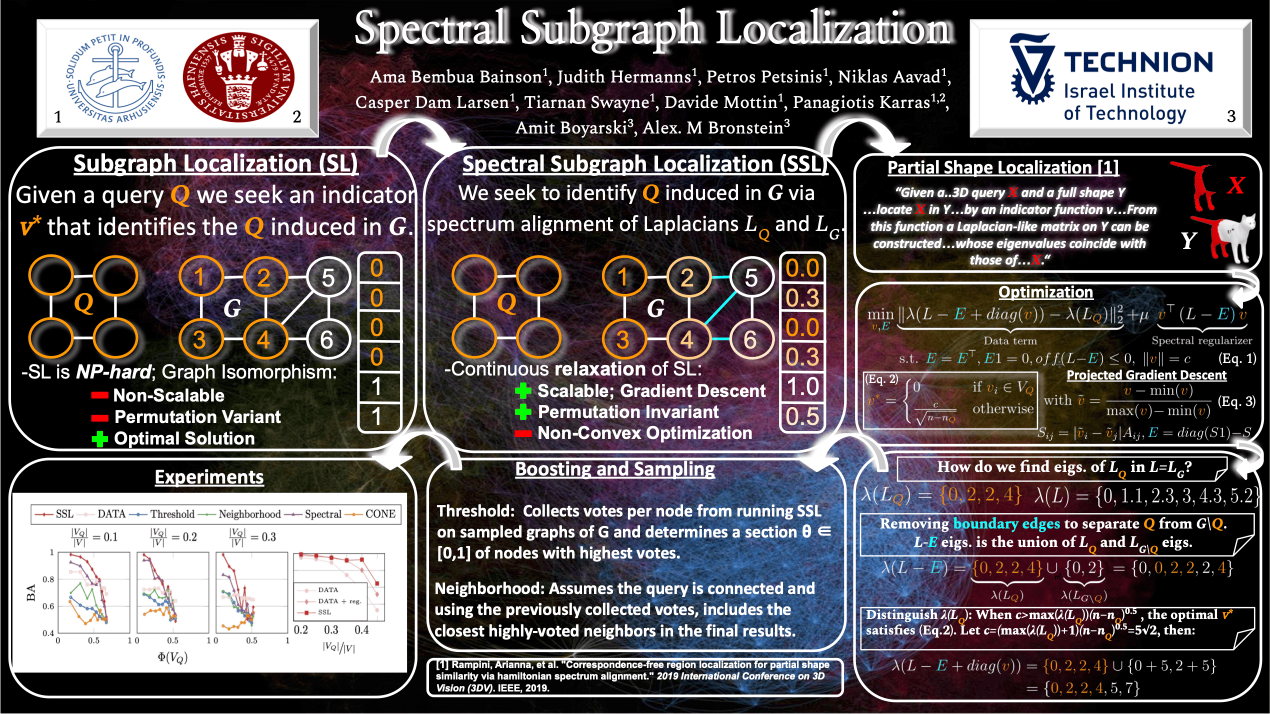 Abstract: Several graph analysis problems are based on some variant of subgraph isomorphism: Given two graphs, G and Q, does G contain a subgraph isomorphic to Q? As this problem is NP-complete, past work usually avoids addressing it explicitly. In this paper, we propose a method that localizes, i.e., finds the best-match position of, Q in G, by aligning their Laplacian spectra and enhance its stability via bagging strategies; we relegate the finding of an exact node correspondence from Q to G to a subsequent and separate graph alignment task. We demonstrate that our localization strategy outperforms a baseline based on the state-of-the-art method for graph alignment in terms of accuracy on real graphs and scales to hundreds of nodes as no other method does.